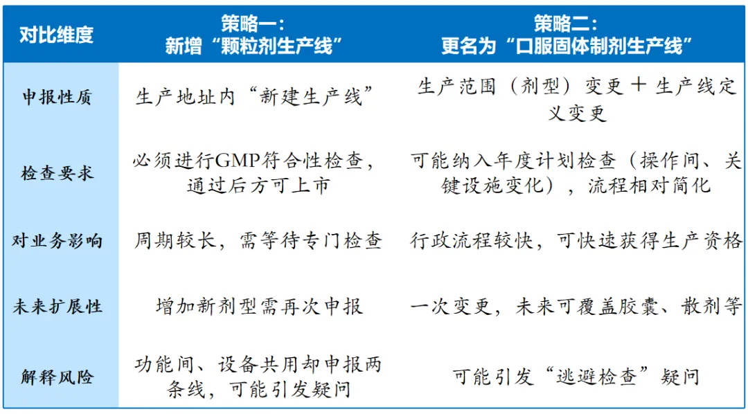 类似的情形还有片剂生产线增加颗粒剂产品,注射液生产线增加冻干产品。这两种策略到底有什么不同?哪种更适合企业的长远发展?今天我们就来详细拆解。当然,这里还需要一个假设。假设省药监局对此类情形的生产线命名和管理方式,更多依据企业自行决定。在深入分析之前,需要先明确一个前提:无论选择哪种策略,实际上都是共线生产。因为胶囊剂和片剂共用同一车间的功能间和生产设备,都需要进行共线生产风险评估和清洁验证。这不是“两条独立生产线”的问题,而是“一条生产线上生产两种剂型”的问题。明确了这一点,我们再聚焦文章讨论的核心----行政许可申报路径的选择差异。本文不讨论共线生产的管控。核心差异是GMP符合性检查要求,新增生产线肯定引发GMP符合性检查,但变更生产线(改变功能间用途、增加生产设备)可能不用开展GMP符合性检查。还有,GMP符合性检查是针对生产线开展,未来GMP符合性检查跟踪检查,接受检查频次可能会更少。基于上述对比,从合规效率和长期发展角度,策略二(变更生产线名称+增加生产范围)是更优的选择,主要基于三点考虑:①避免重复建设,符合柔性生产实际。将生产线定义为“口服固体制剂生产线”更符合企业实际的柔性生产模式。片剂、颗粒剂、胶囊剂等口服固体剂型在制粒、干燥、总混等工序上具有高度共通性,一次变更即可覆盖未来可能增加的其他剂型,无需反复申报“新增生产线”。