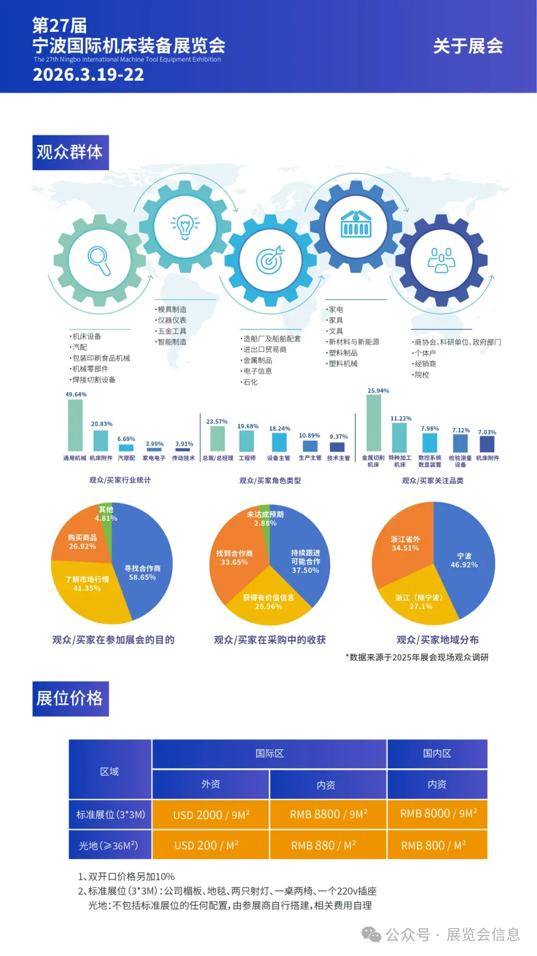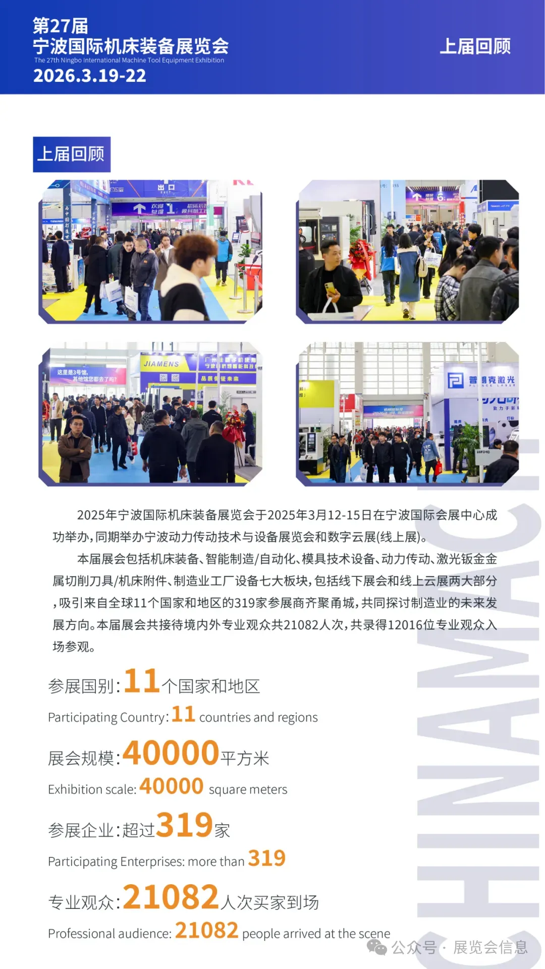 第27届宁波国际机床装备展览会将于2026年3月19—22日在宁波国际会展中心举行。本次展会预计将有来自中国、德国、美国、日本、韩国、英国、意大利、瑞士、西班牙、新加坡、香港、中国台湾等国家和地区300家展商参展,预计将吸引50000名专业观众前来参观洽谈。