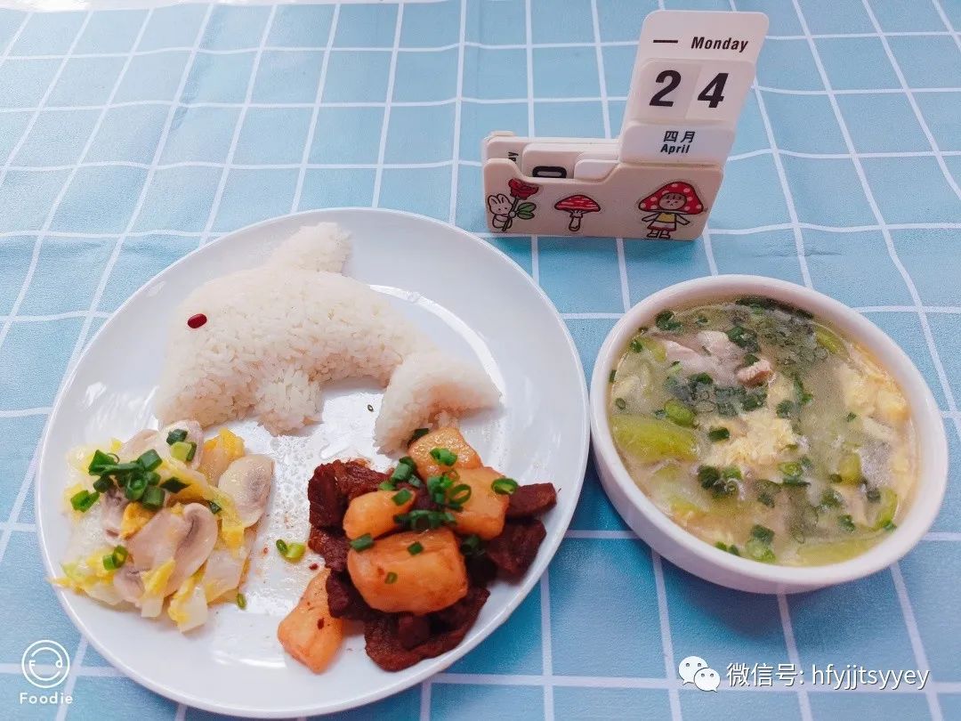 午餐:香米饭 土豆烧牛肉 娃娃菜烩口蘑 丝瓜肉片蛋汤