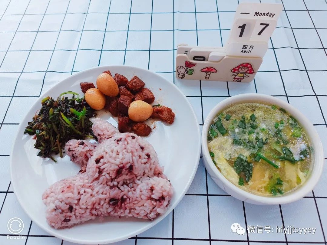 午餐:紫米饭 肉沫蒸蛋 炝炒西蓝花 鸡丝沙汤