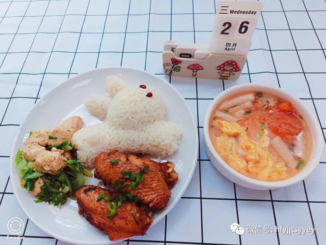 午餐:香米饭 秘制红烧鸡翅 白菜豆腐 西红柿三鲜汤