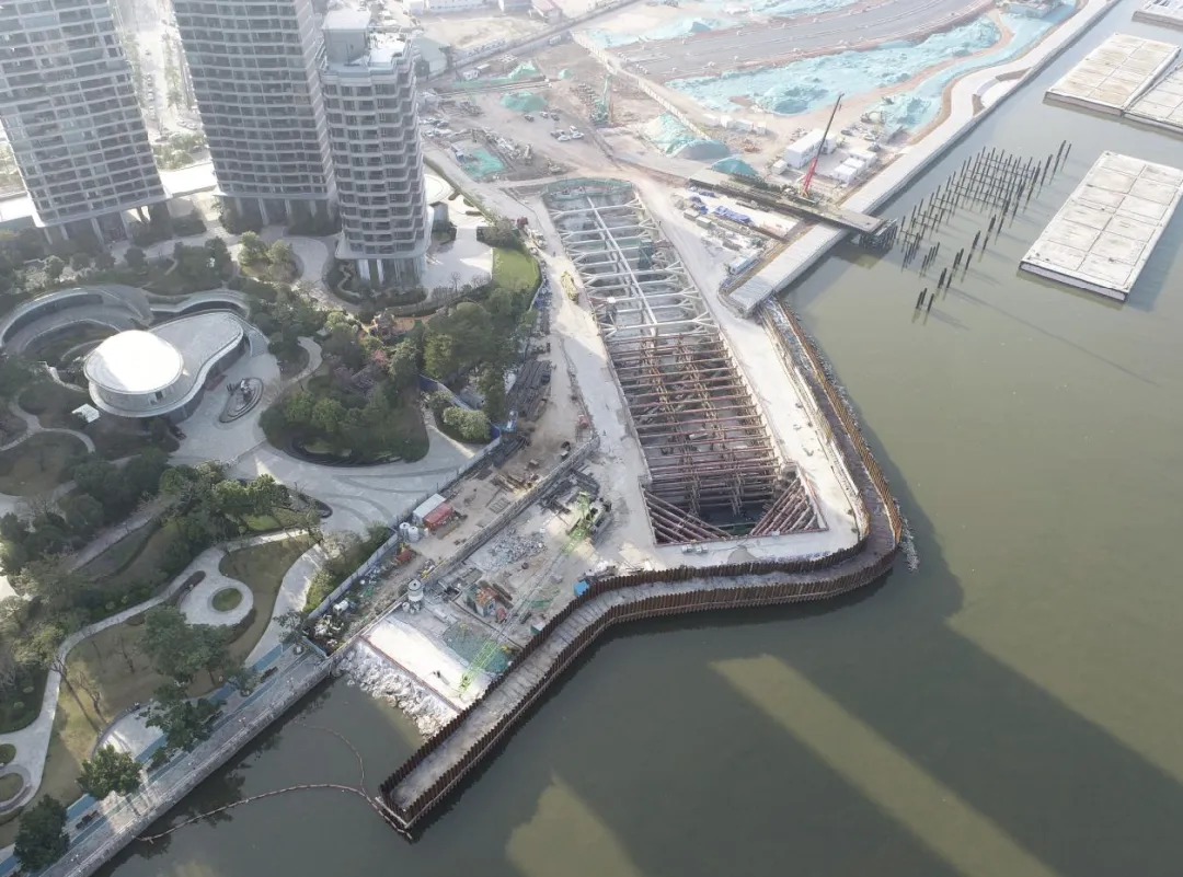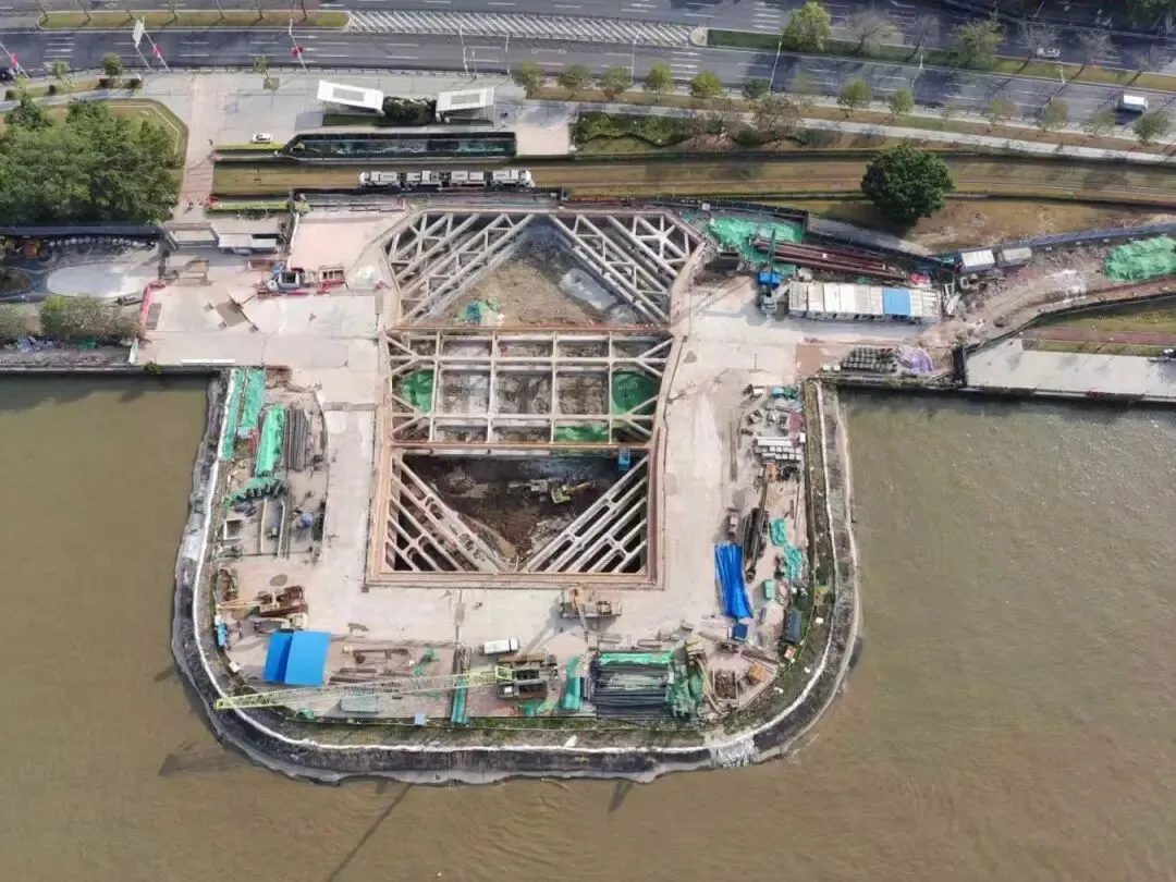 项目沿线设连续下穿珠江及芳村大道南隧道一座、跨工业大道及规划一路路口的双分离立交一处,是集隧道、桥梁、道路于一体的综合性市政工程。目前,项目已完成荔湾对接端隧道主体结构施工,江中段沉管管节完成首次浇筑,正全面开展堤防修复及二次浇筑钢平台搭设工作。