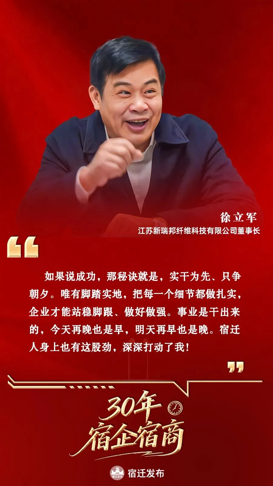 实干者不负时光,奋斗者终有回响。徐立军与他的事业,在宿迁这片热土上扎根生长,也让我们看见:唯有脚踏实地、久久为功,方能在时代浪潮中,书写人与城双向奔赴的美好答卷。
