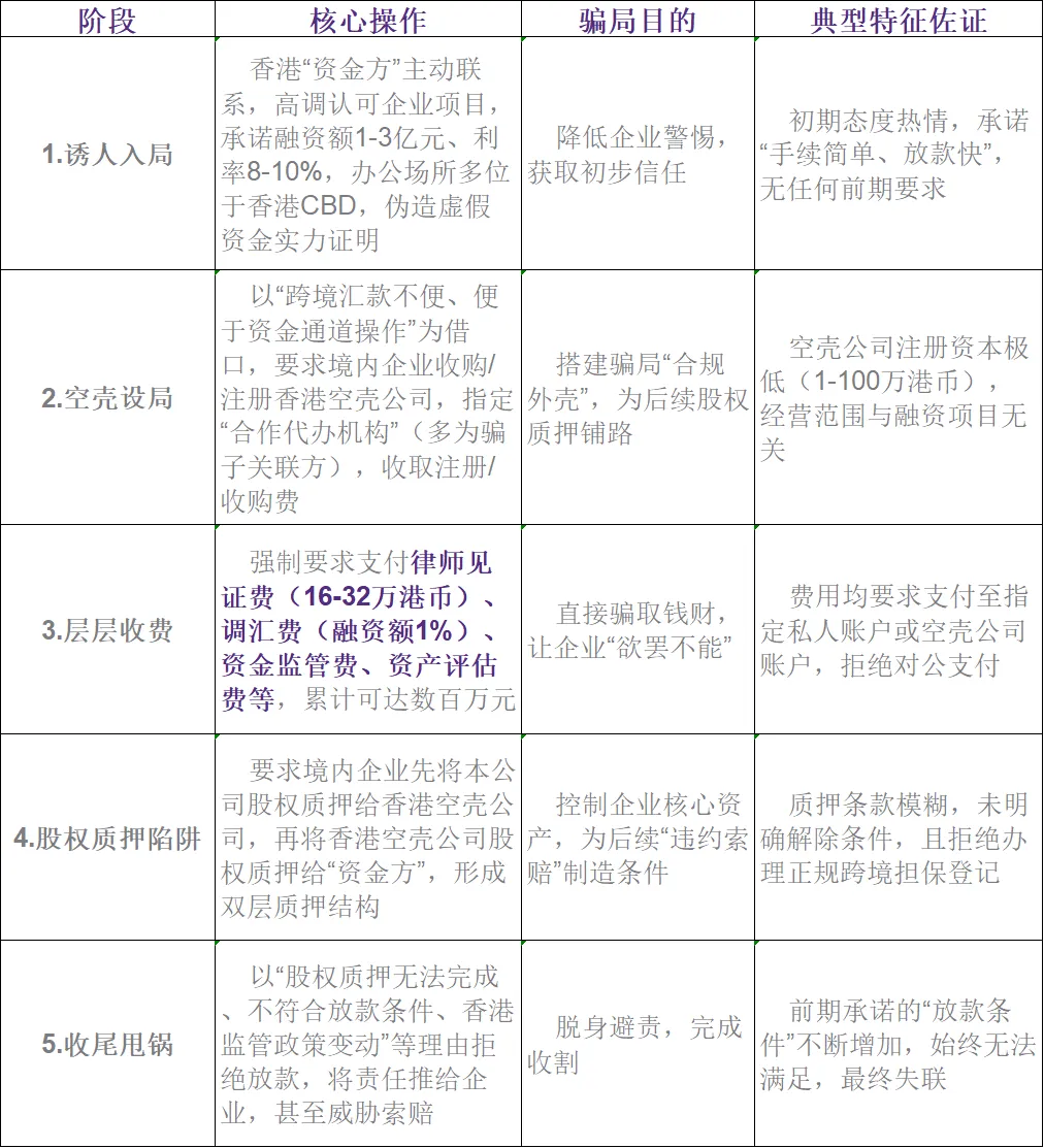 团队经穿透式研判与案例比对,确认此类情形属于近年高频爆发的香港跨境融资骗局,套路高度固化、风险极具隐蔽性,已造成大量境内企业财产损失,亟需行业高度警惕。
