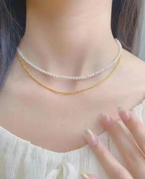 我之前有一次在展销会买过一条锁骨链 足金的 那时候被灯光一打 整个人就是那种“这个真的绝了”的状态 每转一次身就闪一下 那种氛围感真的会让人上头 戴回家前几天也是各种拍照打卡 朋友都说显白 而且这种细细的链子配白衬衫 简单T恤 都挺好看的 就是那种穿什么都不出错的安全牌