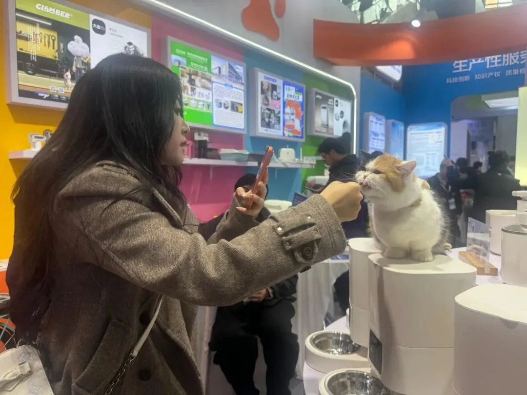 开展首日,慈溪会展中心格外热闹。专程从杭州带着自己的宠物猫前来逛展的李女士,在一众宠物智能家电前流连忘返,认真为“猫主子”挑选着合适的产品。她的猫咪似乎也对宠物饮水机颇感兴趣,成了现场特殊的“体验官”。