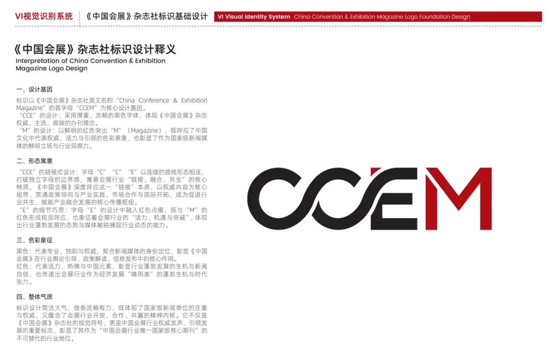 全新的《中国会展》杂志社标识以英文名称“China Conference & Exhibition Magazine”的首字母“CCEM”为核心设计基因。其中,“CCE”三个字母以厚重流畅的黑色线条相连,打破了字母间的边界,象征着会展行业“链接、融合、共生”的核心理念,体现了《中国会展》作为连接政策、产业、国际视野的核心枢纽作用。而字母“M”则采用鲜明的中国红色,既代表着作为国家级新闻单位的鲜明立场,也传递出行业的活力、机遇与引领姿态。