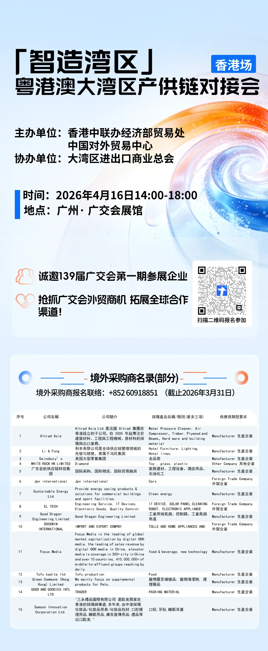 为充分发挥广交会 “贸易之桥” 平台效能,精准链接大湾区优质企业与全球采购资源,第139届广交会「智造湾区」粤港澳大湾区产供链对接会・香港场 即将重磅开启!本次活动由香港中联办经济部贸易处、中国对外贸易中心联合主办,大湾区进出口商业总会协办、深圳市进出口商会等9+2 城市商协会支持,为大湾区企业搭建直面全球采购商的高效对接平台,抢抓广交会外贸商机,拓展全球合作渠道,就在此刻!