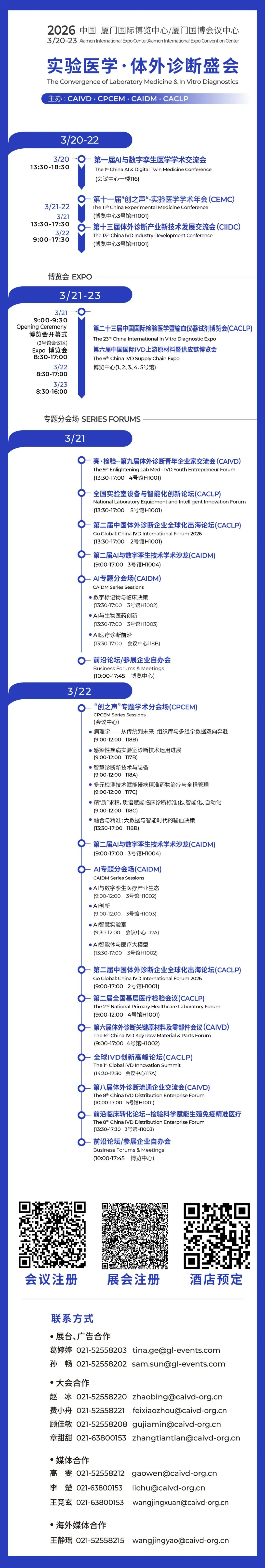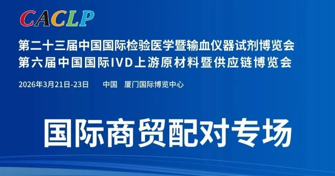 第二十三届中国国际检验医学暨输血仪器试剂博览会、第六届中国国际IVD上游原材料暨供应链博览会(CACLP),第十一届“创之声”-实验医学学术年会、第十三届体外诊断产业新技术发展交流会,第一届AI与数字孪生医学学术交流会暨第二届AI与数字孪生技术学术沙龙将于2026年3月20日至23日在厦门国际博览中心隆重举行。