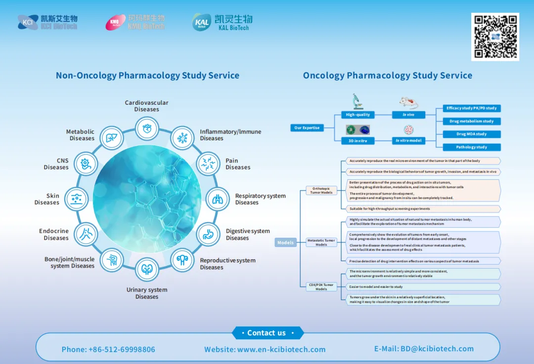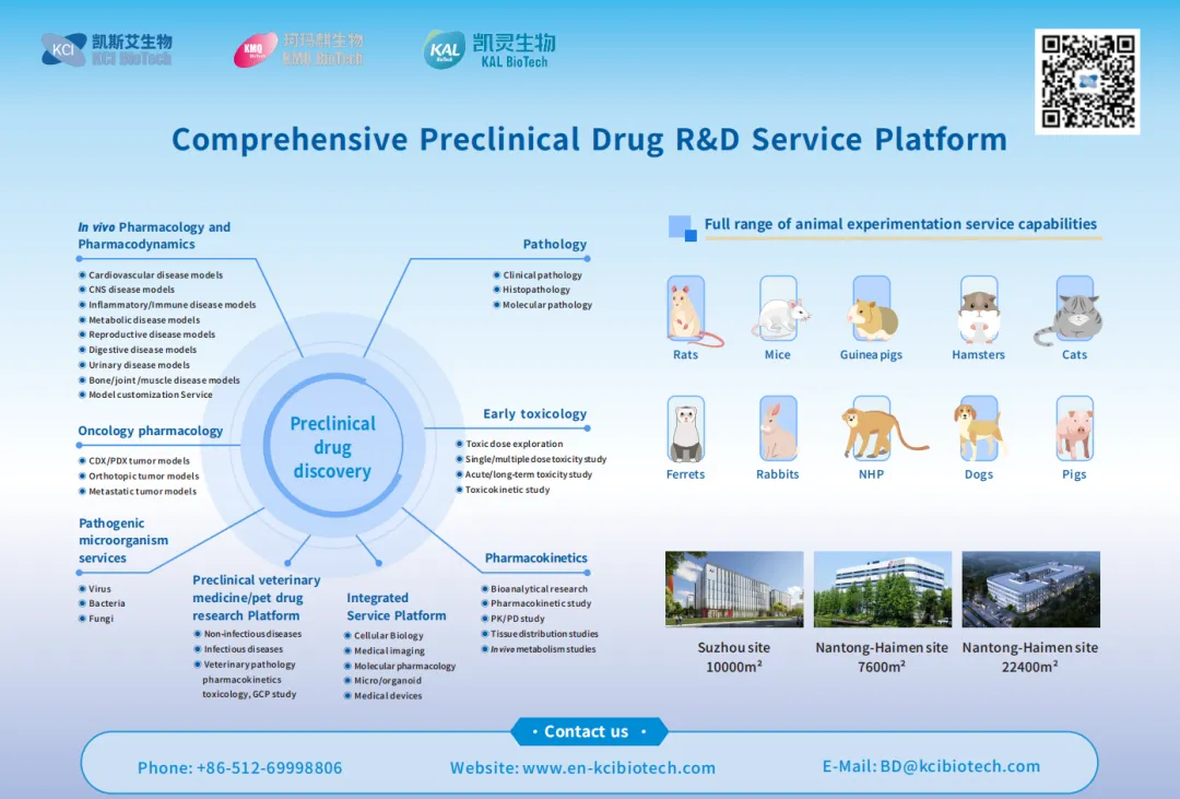 KCI/KMQ/KAL将凭借专业一体化研发团队、丰富的体内药理药效学评价经验、诚信卓越的职业精神,为全球制药企业和科研机构提供全方位的临床前新药研发服务,建立专业高效的药物研发评价体系。
