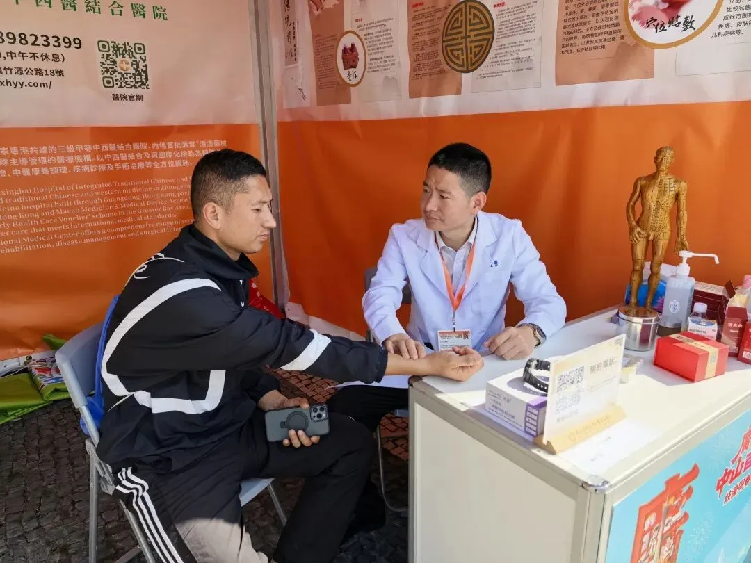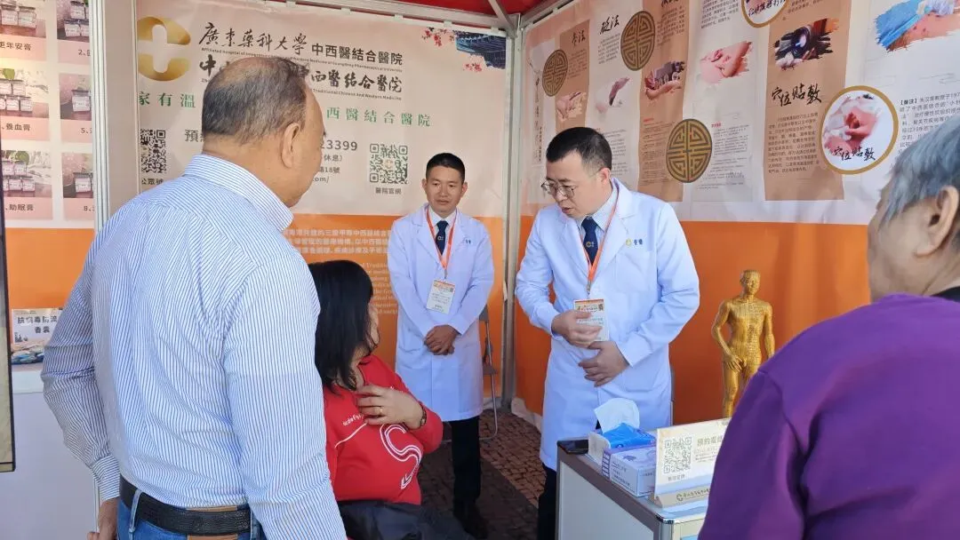 广东药科大学中西医结合医院(中山陈星海中西医结合医院)作为其中的核心力量与明星单位,由黄汉伟院长率领的医护团队亮相展会,实力“出圈”,全方位展现了其在中医药康养领域的深厚积淀与创新活力,成为濠江岸边一道靓丽的健康风景线,不仅收获了大量市民“粉丝”,更与澳门业界擦出了实质合作的火花。现场还接受了香港商报、中山日报等多家媒体采访。