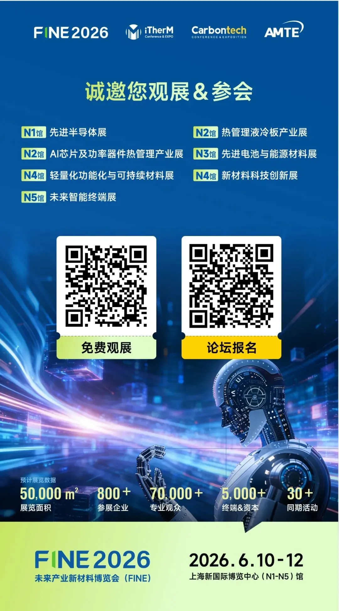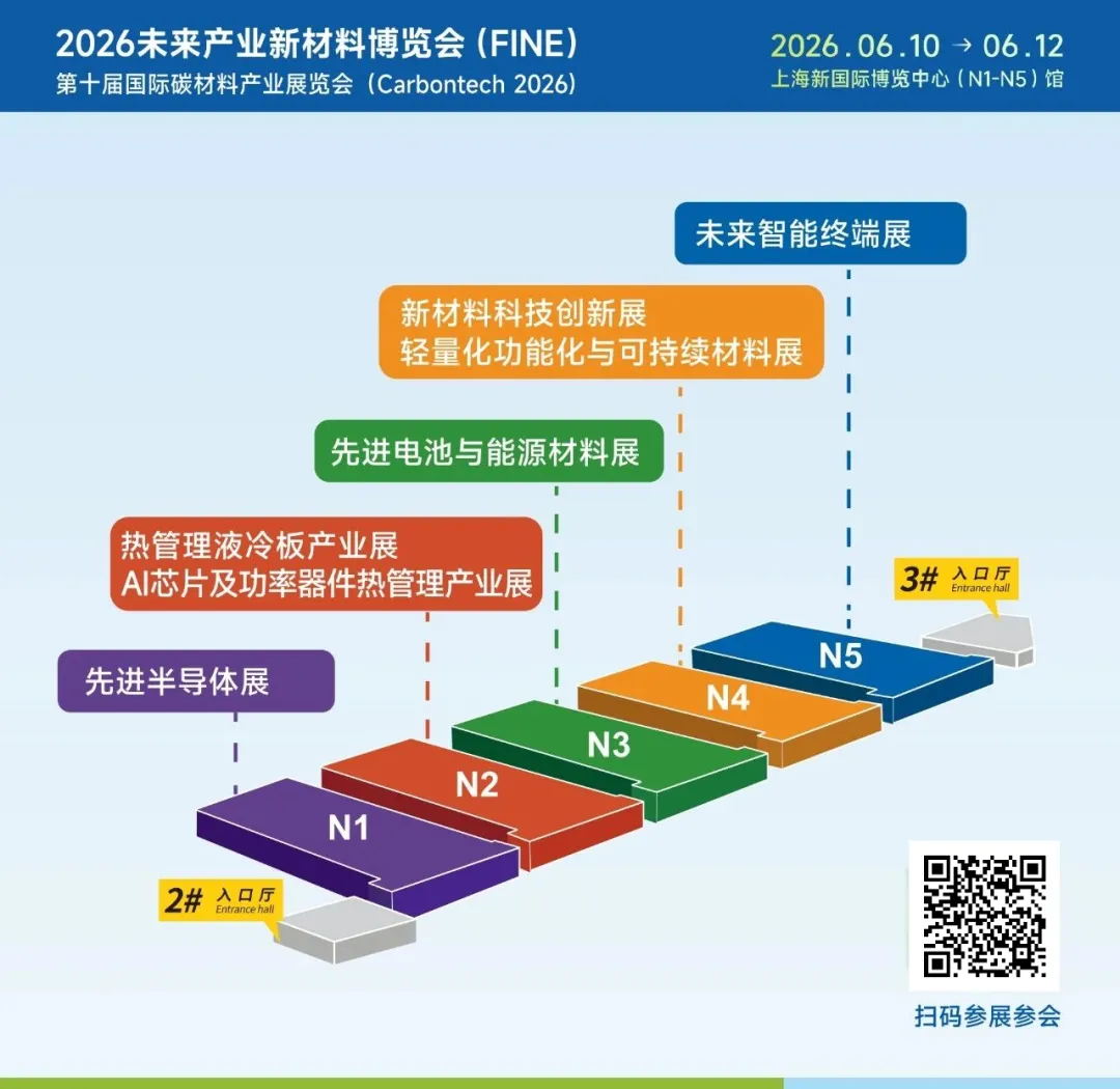 FINE 2026,将围绕未来产业五大共性需求,特设7大特色主题展区(先进半导体展、先进电池与能源材料展、AI芯片及功率器件热管理展、热管理液冷板产业展、轻量化功能化与可持续材料展、新材料科技创新展、未来智能终端展),预计吸引800+优质展商参展。