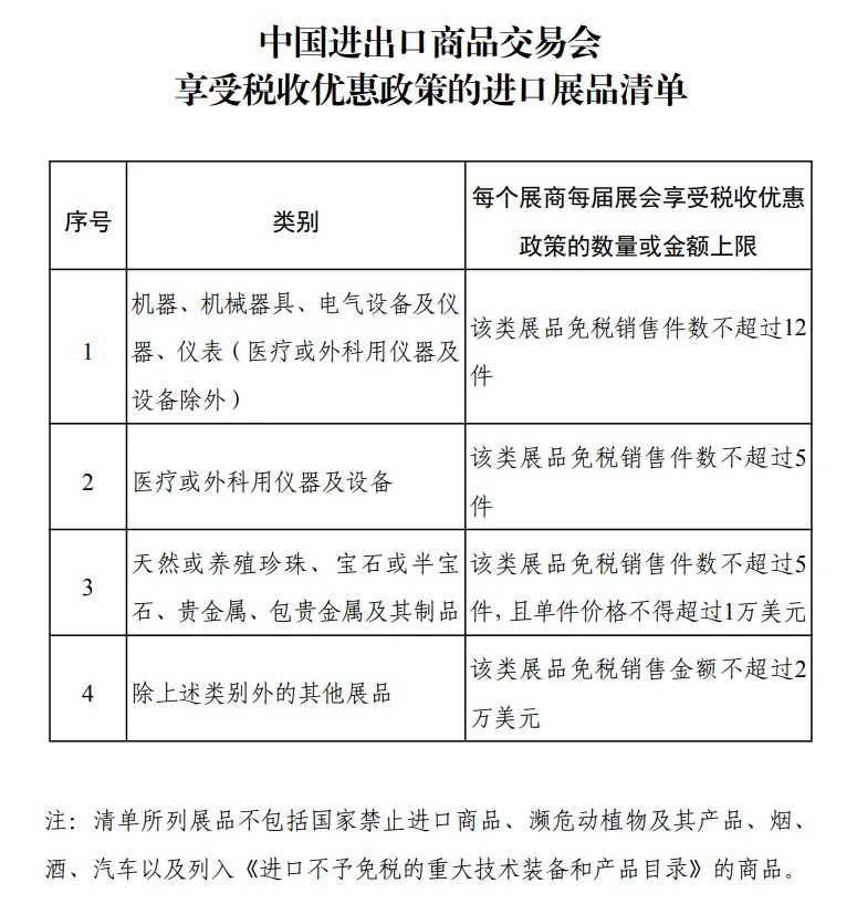 为更好发挥中国进出口商品交易会(以下简称广交会)对外开放平台作用,财政部、海关总署、税务总局联合印发《关于“十五五”期间中国进出口商品交易会展期内销售的进口展品税收优惠政策的通知》,明确对“十五五”期间举办的广交会,每个展商在展期内销售的免税额度内的进口展品,继续免征进口关税、进口环节增值税和消费税。同时,为进一步释放政策效应,免税销售额度由按年度计算调整为按每届展会计算。