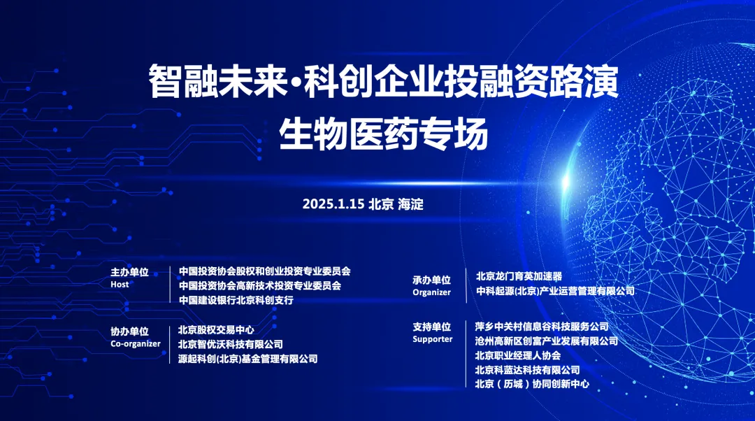 2025年1月15日,“智融未来·科创企业投融资路演--生物医药专场”活动在北京成功举办。本次活动由中国投资协会股权和创业投资专业委员(简称中国投资协会创投委)、高新委、中国建设银行北京科创支行共同主办,北京龙门育英加速器、中科起源(北京)产业运营管理有限公司承办,北京股权交易中心、源起科创(北京)基金管理有限公司、北京智优沃科技有限公司协办,萍乡中关村信息谷科技服务公司、沧州高新区创富产业发展有限公司、北京职业经理人协会、北京科蓝达科技有限公司、北京(历城)协同创新中心鼎力支持。