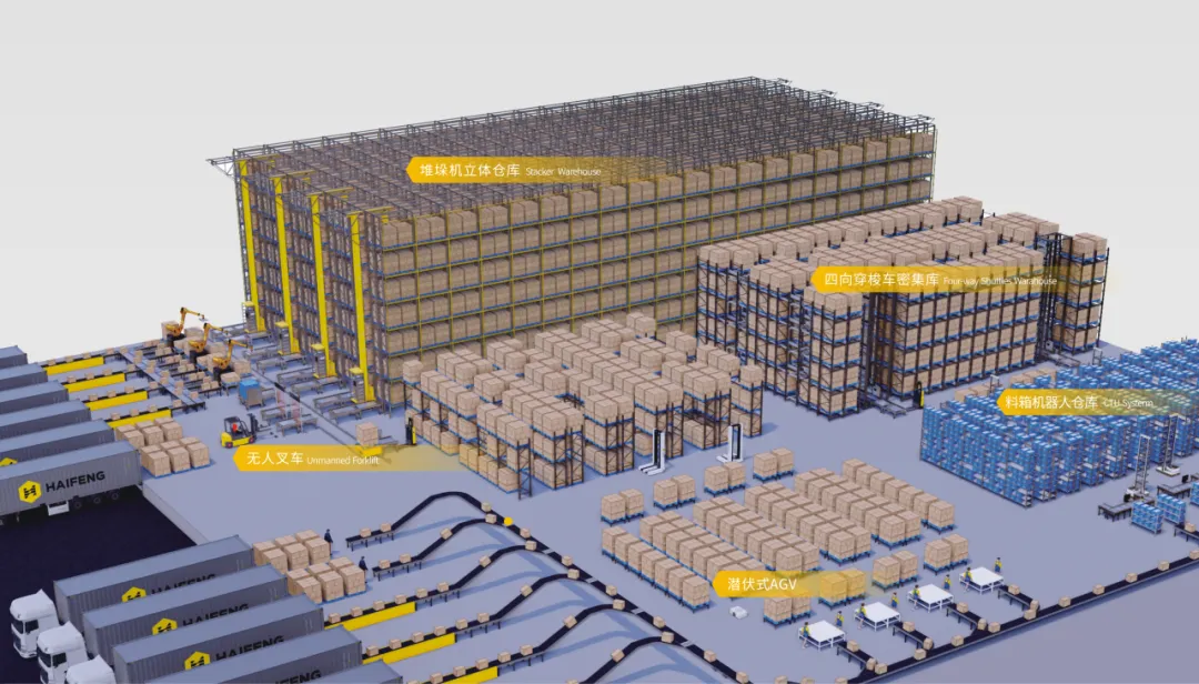 解决方案涵盖AGV、料箱机器人立体仓库、托盘堆垛机立体仓库、四向穿梭车立体仓库、辅料亮灯拣选系统以及WMS/WCS智能仓储软件等核心软硬件。