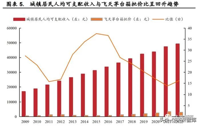 白酒作为兼具消费与投资属性的消费品,与整体宏观经济态势具有较大关联性。宽松的信用政策有助于提振实体的信心,助力实体融资需求持续改善,进而有利于白酒行业逐步恢复并进入上行周期。除了信用政策以外,由于白酒具备消费与投资属性,相较于其他消费品而言,从供给端来讲,居民可支配收入的情况对于白酒需求具有重要意义;而判断白酒行业景气度的指标之一为高端白酒的批价情况。二者结合起来看,当前城镇居民人均可支配收入与飞天茅台箱批价的比值正呈回升趋势,伴随居民收入提升及信用回暖,白酒行业消费升级逻辑将重新演绎。