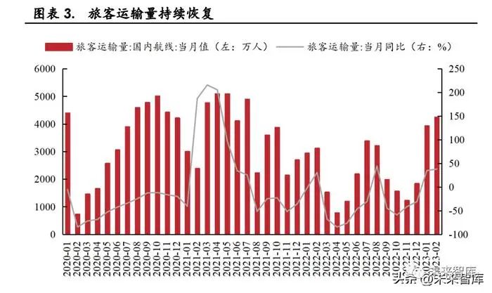 民航复苏彰显出强劲的消费需求。随着疫情管控政策的放开,我国国内航线的旅客运输量大幅上涨,显示出文旅消费信心的修复,这将带动交通、餐饮、住宿、大消费等领域更快复苏。2023 年1 月-2 月国内航线旅客运输量分别为 3933.20/4249.50 万人,同比分别增长34.80%/38.00%;同时2023 年 1 月较 2022 年 12 月环比大幅提升,同比增速环比提升约65.7pct,2023 年 2 月较 2023 年 1 月同比增速环比提升3.2pct。春节期间返乡潮带动出行需求增加、节后商务活动出差增加,也从侧面反映出我国民航业在疫情防控和经济恢复中展现出强劲活力和发展潜力。从消费回暖的角度看,这对于促进文化和旅游产业链条协同发展、推动交通基础设施建设和改善、拉动相关领域消费需求和投资意愿都有积极作用。