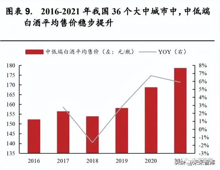 行业高端化趋势明显,产品结构持续升级。从白酒产品的销售价格来说,白酒行业的平均售价受到多重因素的影响,包括宏观经济走势、产业政策、行业库存周期、食品安全事件等。具体到数据来看,2016-2021年我国 36 个大中城市超高端及高端以上白酒平均售价逐步提升,由2016年的791.0 元/瓶增长至 2021 年的 1173.6 元/瓶,年均复合增长率达到9.1%。同时中低端白酒平均售价相对较为稳定,2016/2021 年我国36 个大中城市中低端白酒平均售价分别为 152.1/178.5 元/瓶,年均复合增长率约为3.3%。从行业拉力端来看,行业景气度的重要标识就在于高端以上白酒的一批价情况,高端及以上白酒一批价持续上升扩大了高端及以上白酒的价格上行空间。而高端及以上白酒一批价提升,能够带动次高端白酒价格带持续提升,整体行业呈高端化趋势。从消费者推动端来看,随着经济发展及居民人均可支配收入的提高,消费者对于白酒消费更加追求高品质产品,“少喝一点,喝好一点”成为消费者的新消费理念。同时由于礼赠等刚性场景的存在,高端及以上白酒的品质能够满足消费者的多样化需求。