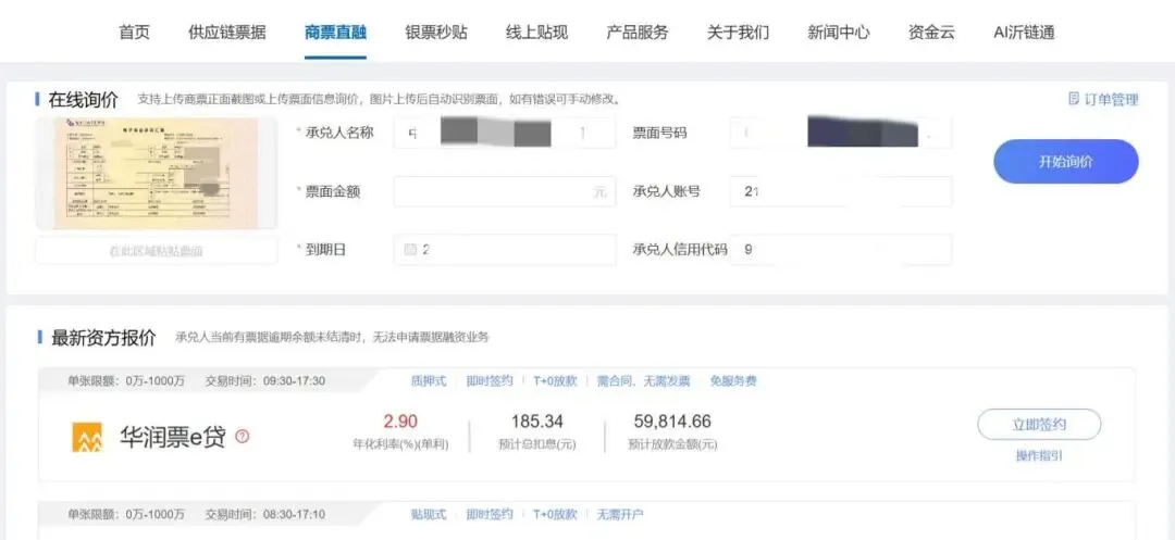 持票企业只需上传票面信息,即可在线向多家金融机构自助询价,发起贴现与质押融资申请,全流程线上直连银行,直接签约审批与融资放款,资金快速到账。