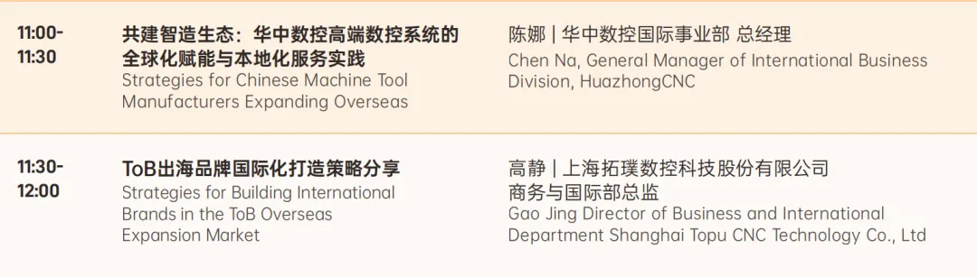 华中数控(HuazhongCNC)国际事业部总经理陈娜将分享高端数控系统的全球赋能实践。上海拓璞数控商务总监高静,将带来一场关于“ToB品牌出海”的实战拆解。她将结合拓璞在高端数控领域的国际化征程,为行业揭秘:如何在高净值市场建立“不可替代”的品牌心智。
