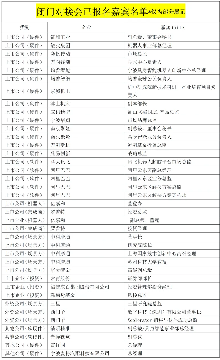 ⏰23日下午更有精准对接会+闭门高层晚宴,已有5️⃣0️⃣+上市公司、外资企业、投资方决策者确认参会(含硬件、软件、场景方、本体企业、政府产业园)