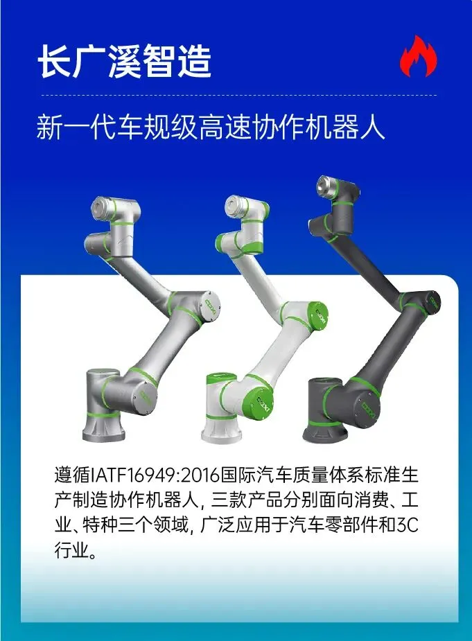 遵循IATF16949:2016国际汽车质量体系标准生产制造协作机器人,三款产品分别面向消费、工业、特种三个领域,广泛应用于汽车零部件和3C行业。