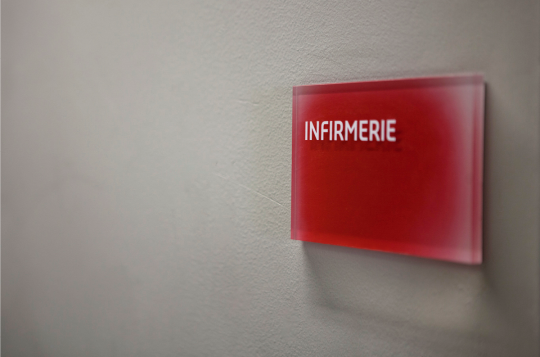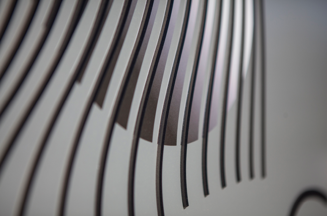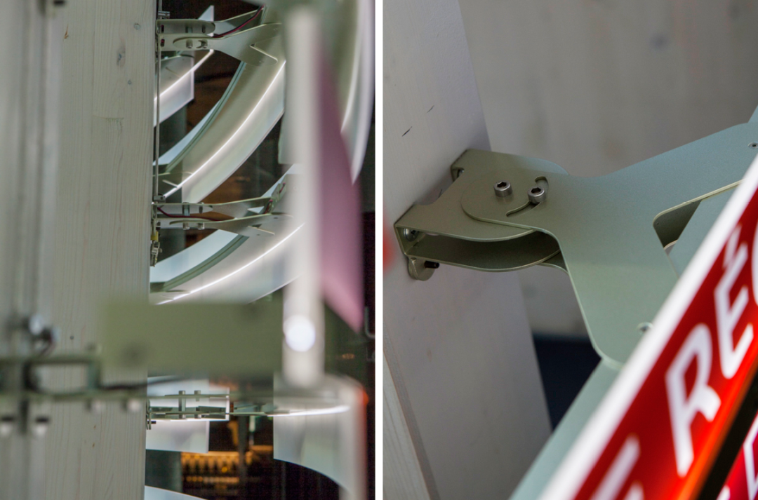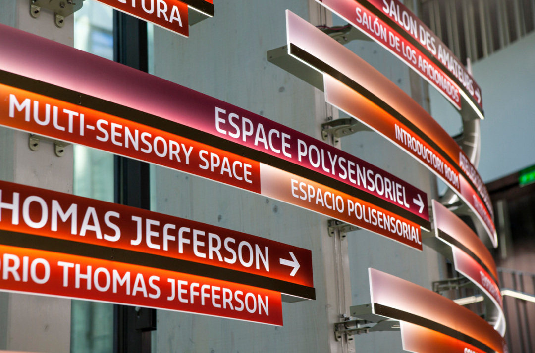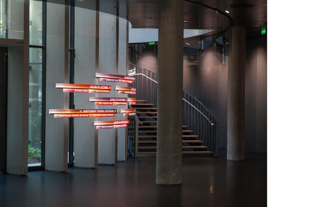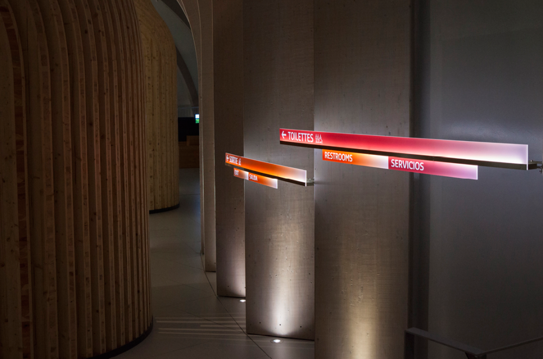 建筑的设计让人联想到葡萄酒在玻璃杯中的转动,autobus imperial公司在标牌中加入了这种强烈的建筑姿态。通过利用空间的曲线,设计了采用带有灯条的弧形结构支架,方形的彩色玻璃面板,配色方案采用葡萄的颜色,整套导视系统个性鲜明。