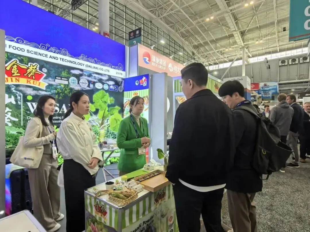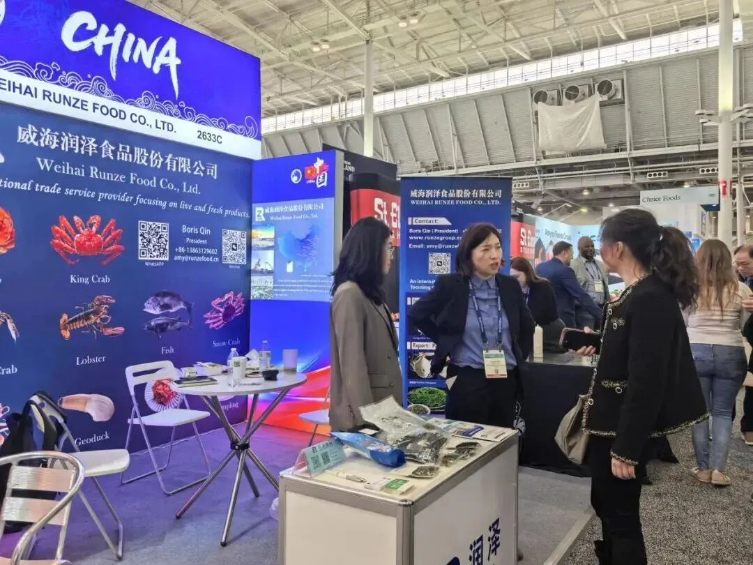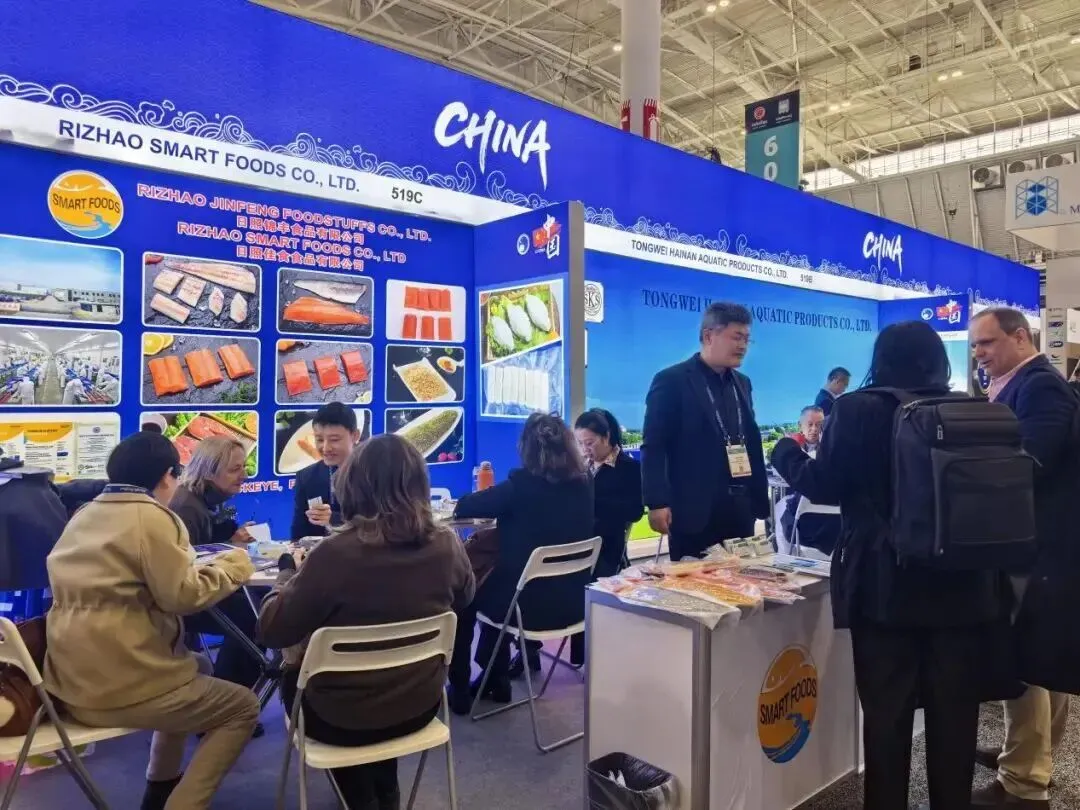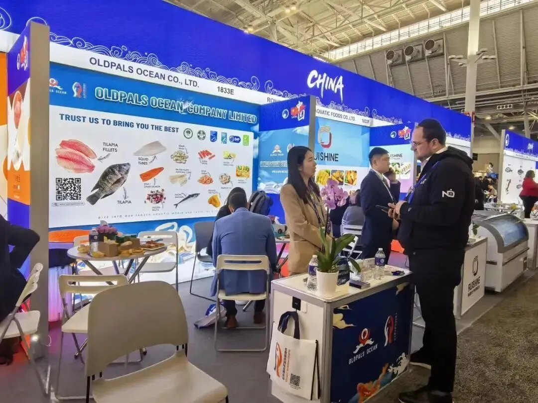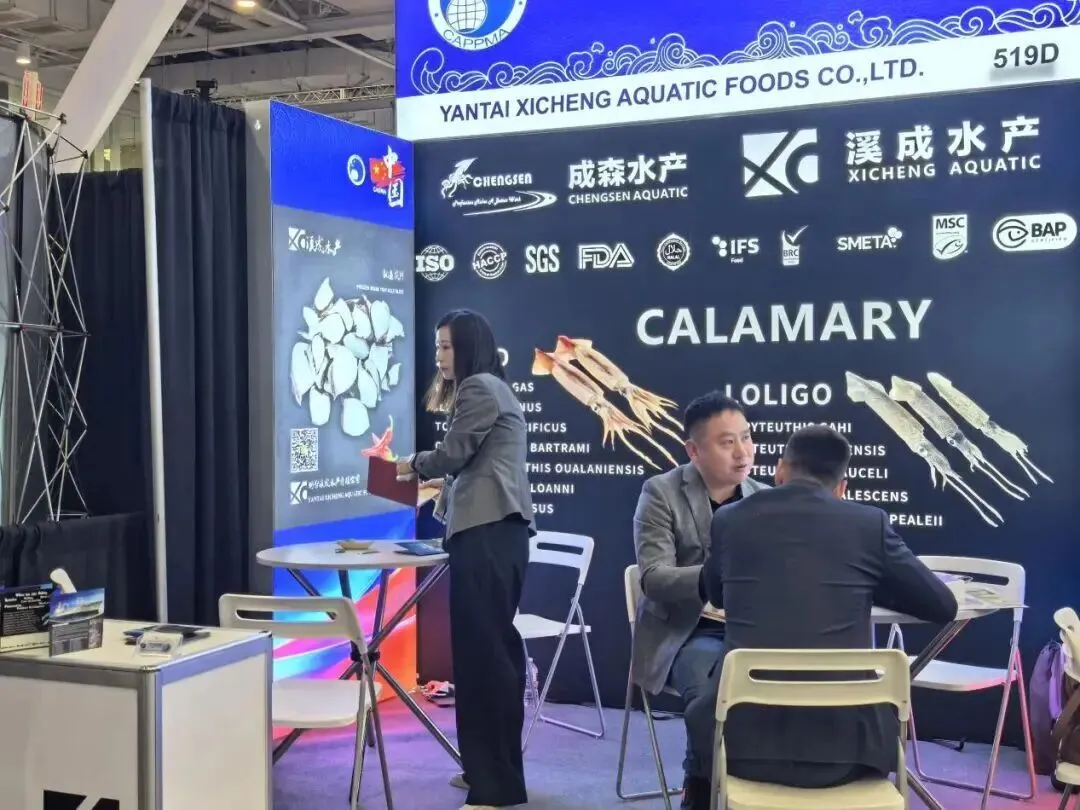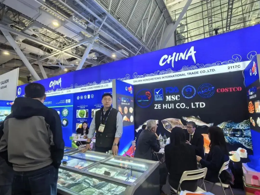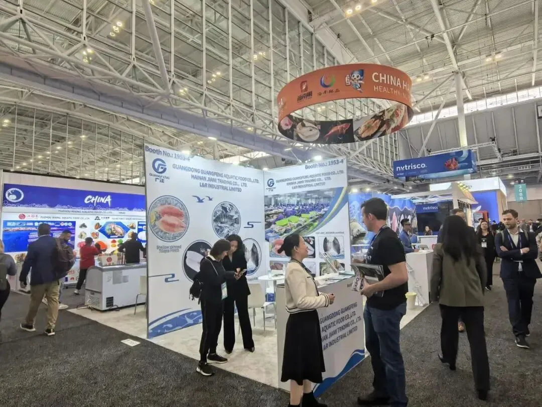 本届展会中,协会精心组织了来自山东、辽宁、海南、福建、广东、江苏、浙江、广西、北京、四川、云南等全国11个省(区、市)的60多家优质企业、近百名企业精英人士,以“中国水产国家展团/出访团”形式集中亮相,其中参展规模在所有海外国家展团中继续稳居首位,充分展现了中国水产行业的雄厚实力与蓬勃生机。今年,参展企业携自身核心产品、创新技术精彩亮相,全方位展示中国水产加工、养殖领域的高质量发展成果,凭借优质的产品品质、先进的生产技术和完善的供应链体系,赢得了北美及全球采购商的广泛关注与高度青睐,为中国水产企业拓展北美市场、深化国际合作搭建了坚实平台。