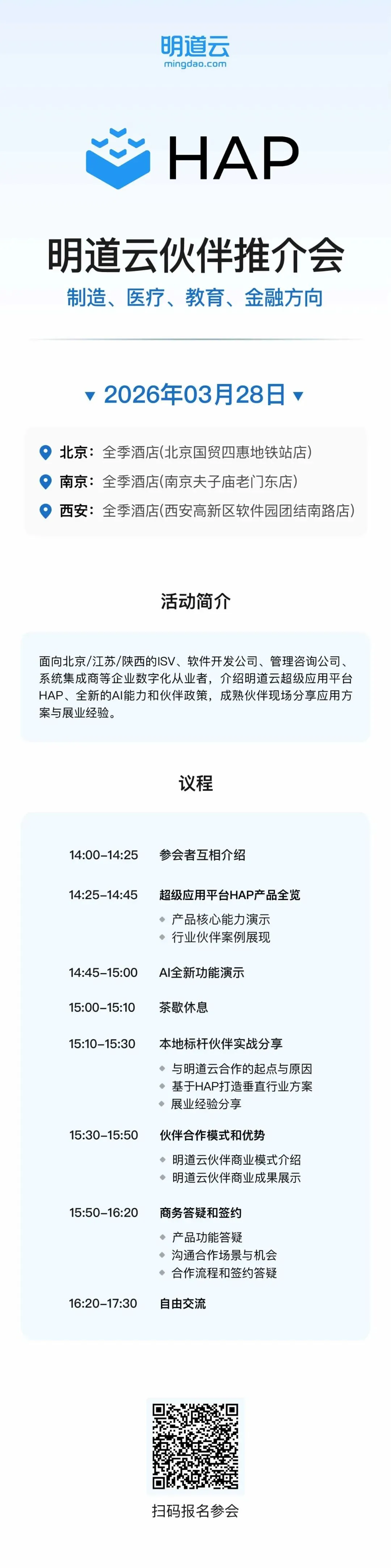 3月28日,明道云将分别在北京、西安、南京三地举办伙伴推介会,欢迎扫码或阅读原文报名。请持续关注我们,了解更多城市的区域伙伴推介会信息。