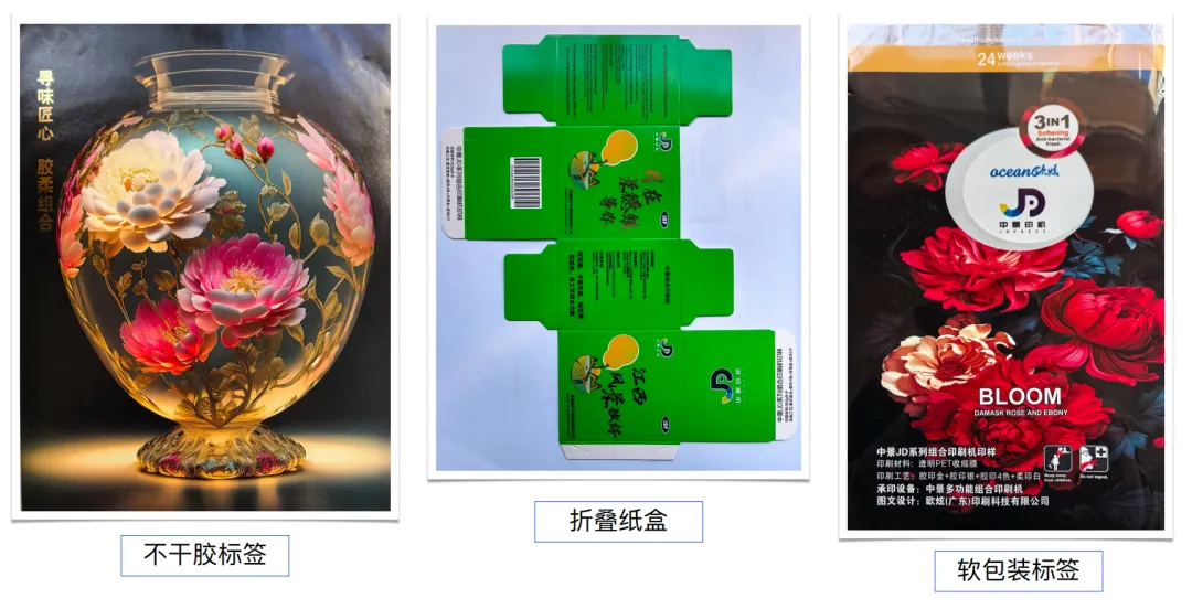 图6为中景印机展位上拿到的样品,展示的设备是胶印和柔印组合的多功能轮转印刷机。从图中可以看出,无论是印刷不干胶标签,或是印刷软包装袋,还是印刷白板卡纸盒,组合印刷机都可以完成,而且印刷质量非常优秀,同传统凹印相比具有自己的特色,可以部分替代凹印机印刷软包装类产品。