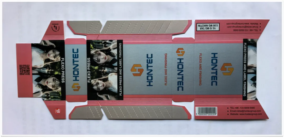 展会上,汇樾(HONTEC)展台展出了“凹印+柔印”组合印刷机,现场演示了包装纸盒印刷,从一大卷白板纸经过印刷加工成为一张包装纸盒半成品,如图7所示。整个加工过程引起了参观者的极大兴趣,观察整个印刷加工过程是:首先,白板纸表面凹版印刷水性银色油墨打底;然后,在金属色表面7个柔印色组分别印刷CMYK和专色;最后,经过两组圆压圆模切对印刷后的材料表面进行压痕和成型模切,完成整个印刷加工过程。