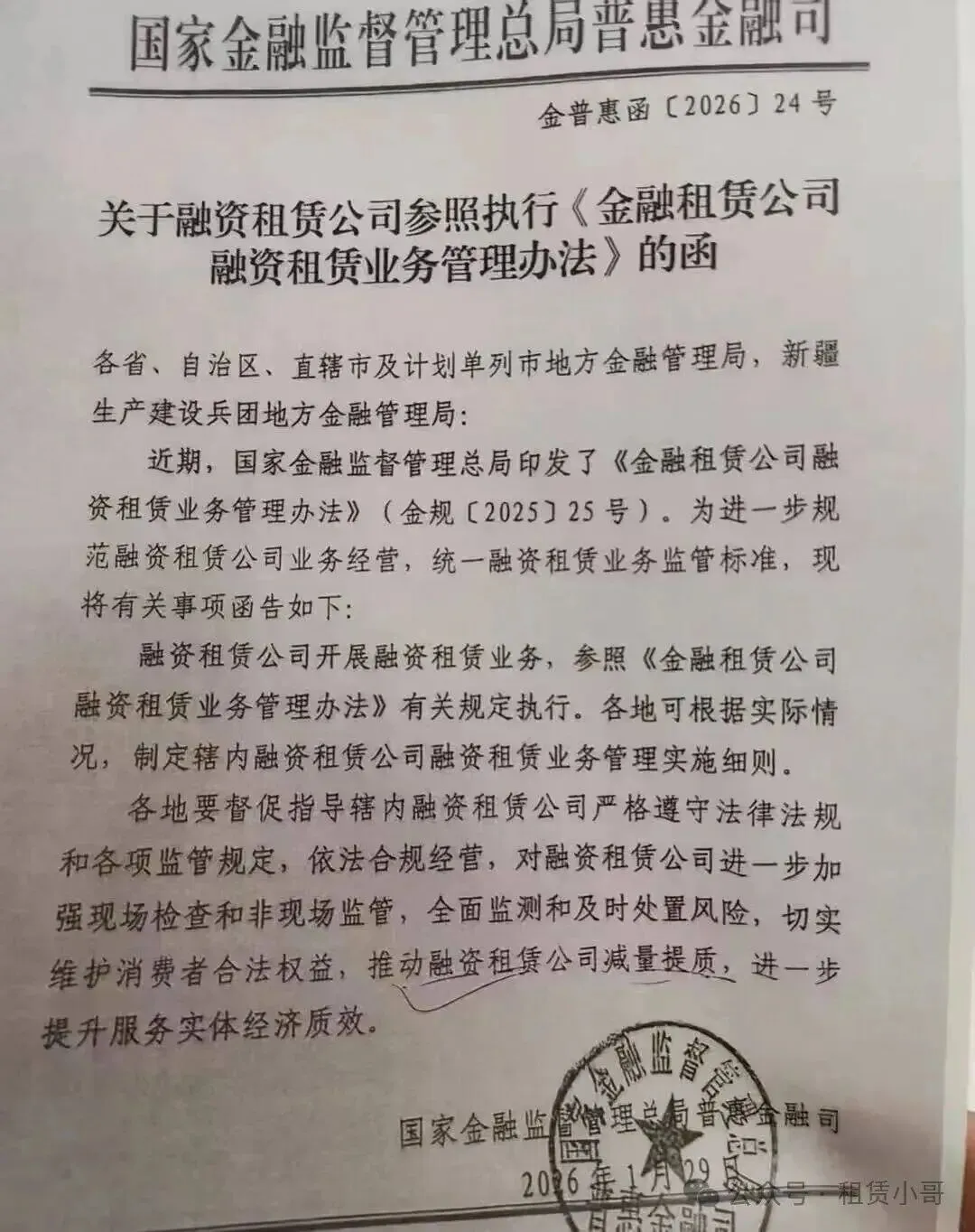 节前,国家金融监督管理总局普惠金融司发函,明确融资租赁公司融资租赁公司参照执行《金融租赁公司融资租赁业务管理办法》。
