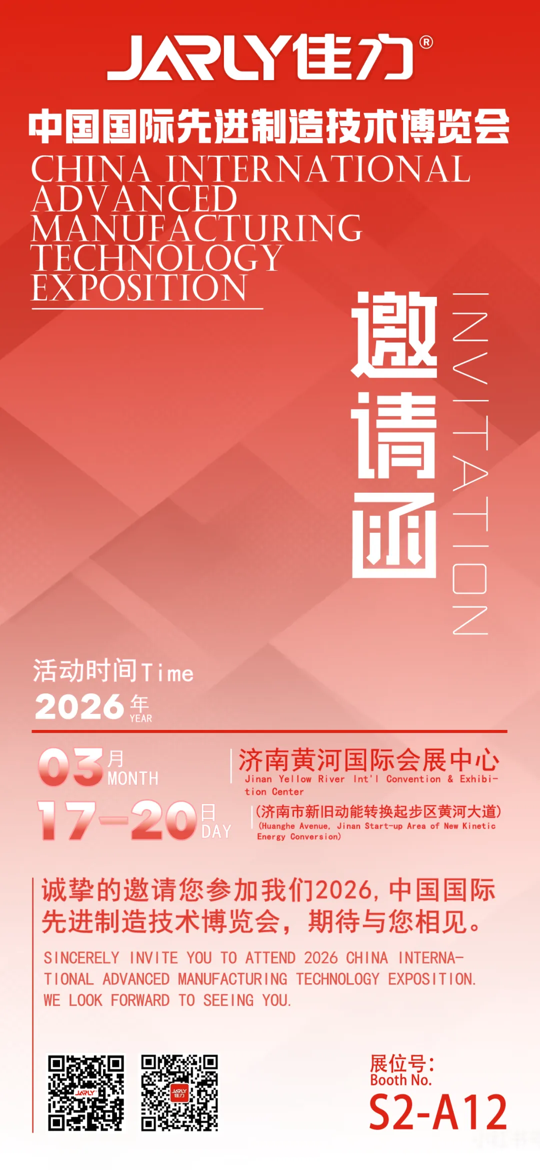 智造无界,安全同行。2026年3月17日-20日,以“智造无界·订单全球”为核心主题的中国国际先进制造技术博览会将在济南黄河国际会展中心盛大启幕。国家级高科技企业佳力防爆车辆制造(山东)有限公司将重磅亮相,展位号S2-A12,诚邀各界客商莅临观展、洽谈合作,共探防爆工业车辆领域的创新发展之路。