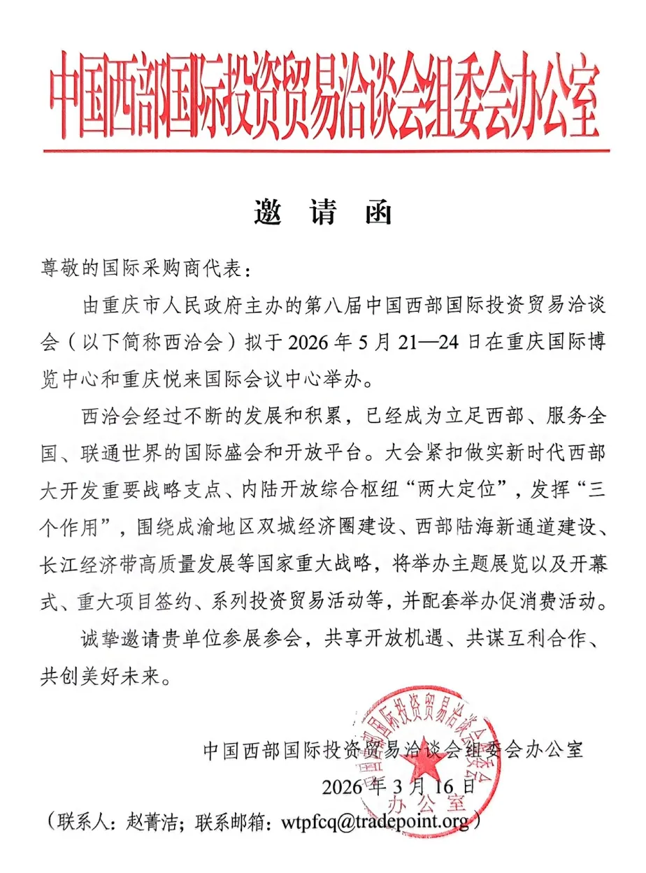在西部大开发战略走深走实、成渝地区双城经济圈建设乘势而上,以及国内国际双循环相互促进的新发展格局引领下,第八届中国西部国际投资贸易洽谈会(以下简称西洽会)将于2026年5月21—24日在重庆国际博览中心盛大举行。