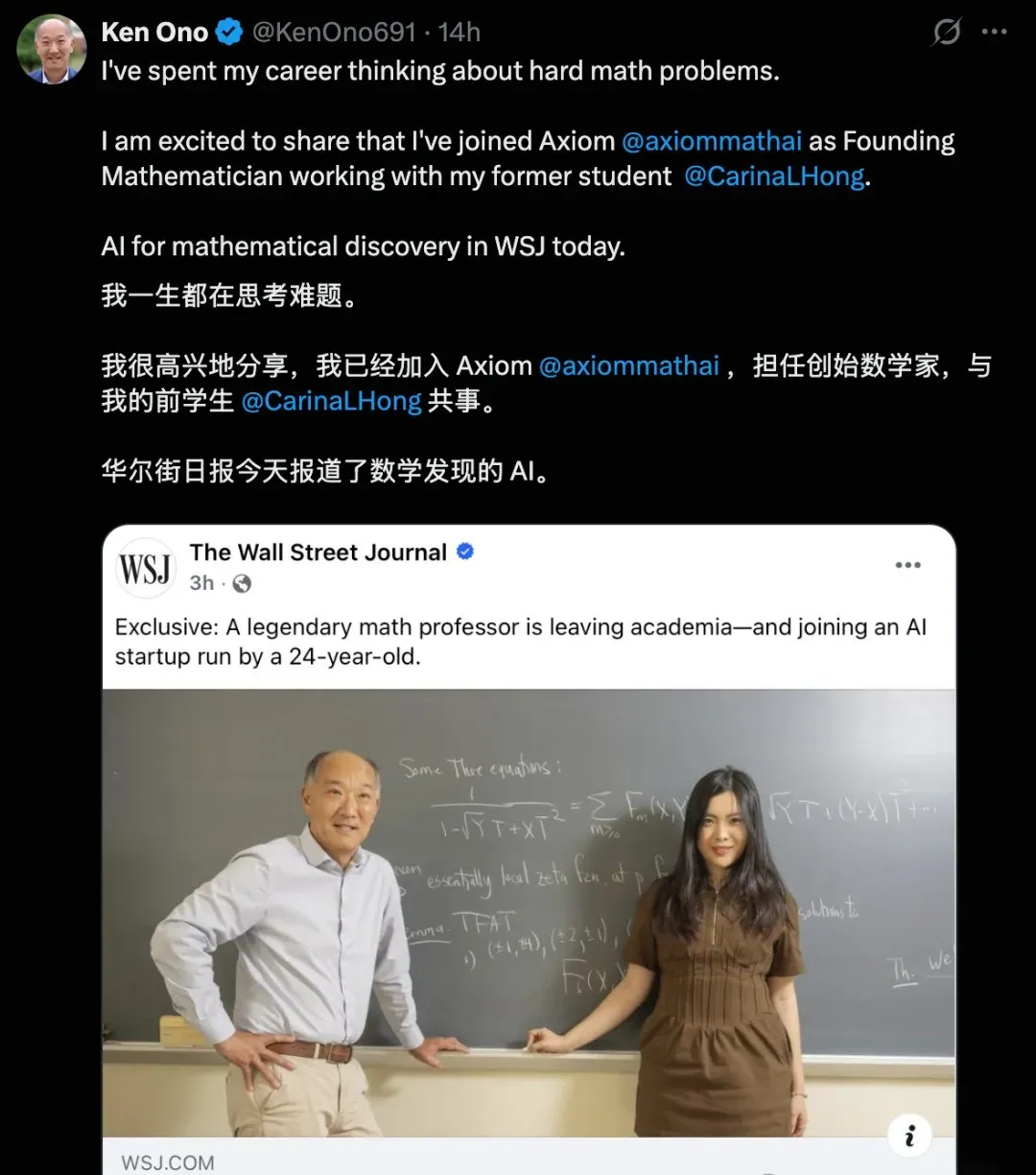 洪乐潼的老师Ken Ono于去年底宣布辞去弗吉尼亚大学的终身教授职位,前往硅谷,全职加入Axiom Math。