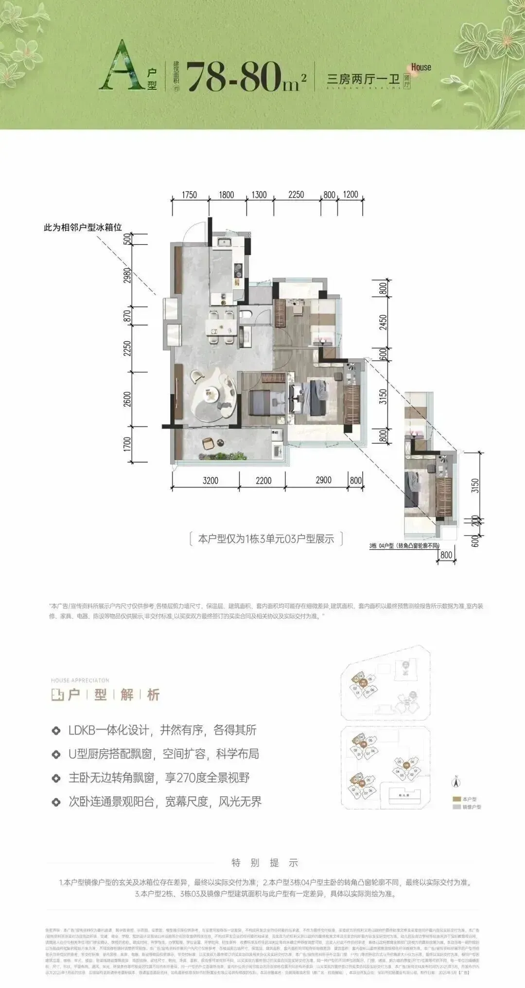 80㎡三房 一卫:约5.4m宽境阳台,三开间向阳;