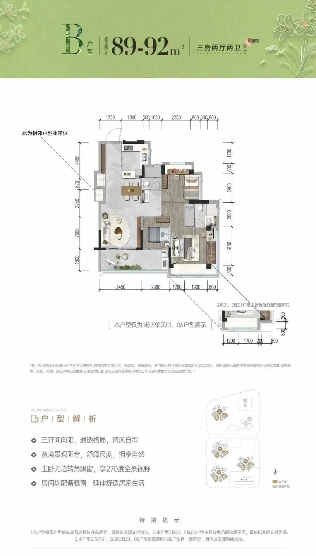 91㎡三房二卫(竖厅):双面L型主卧飘窗,全屋舒阔尺度;