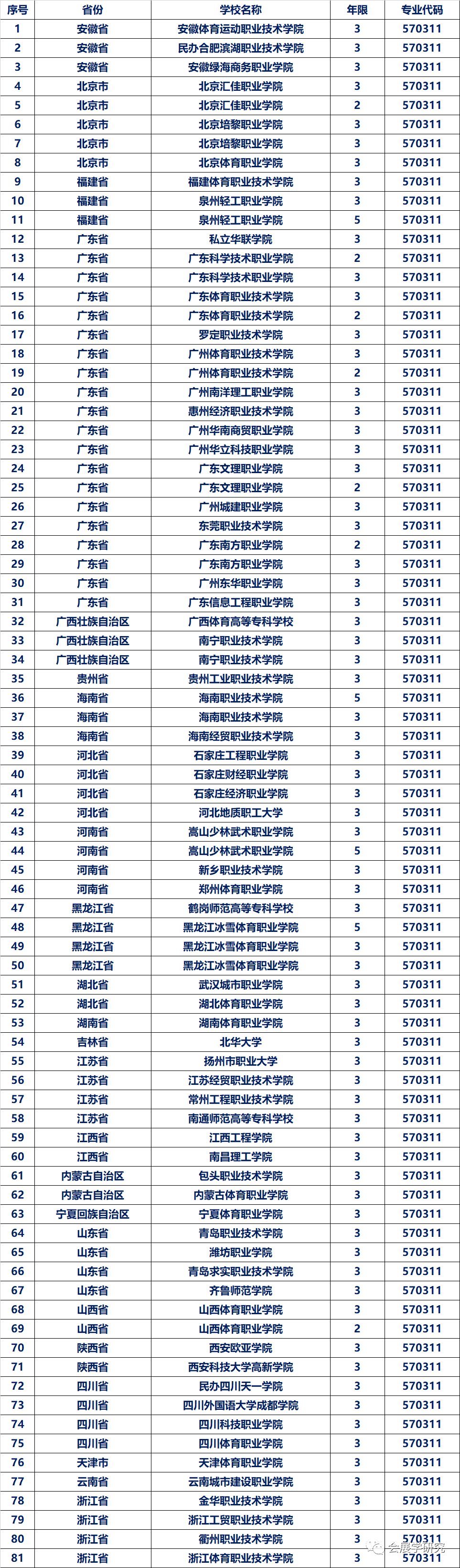 (6)67所院校开设了81个“体育运营与管理”(专业代码:570311)专业点,其中,有13所院校开设了2-3个专业点,分别是:北京汇佳职业学院、北京培黎职业学院、山西体育职业学院、黑龙江冰雪体育职业学院、泉州轻工职业学院、嵩山少林武术职业学院、广东科学技术职业学院、广东体育职业技术学院、广州体育职业技术学院、广东文理职业学院、广东南方职业学院、南宁职业技术学院、海南职业技术学院。