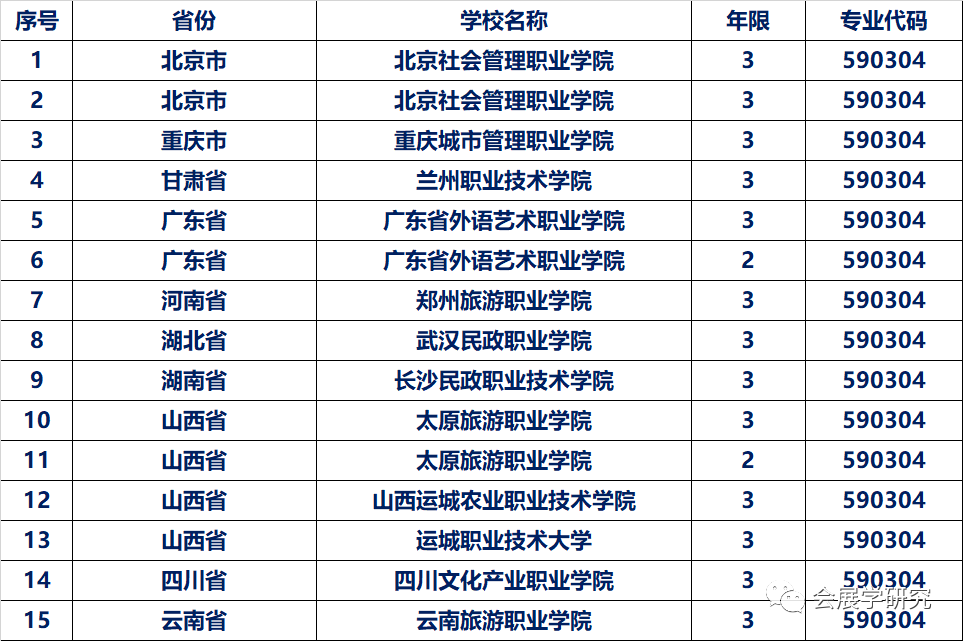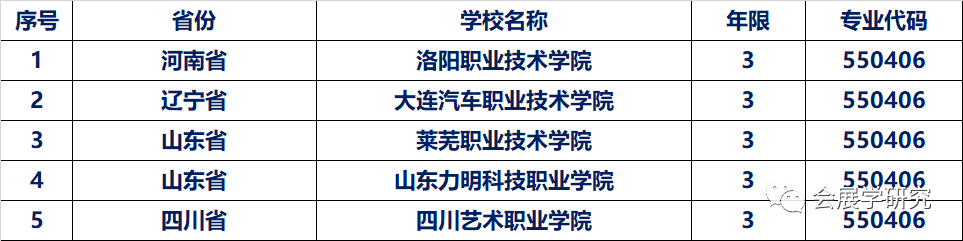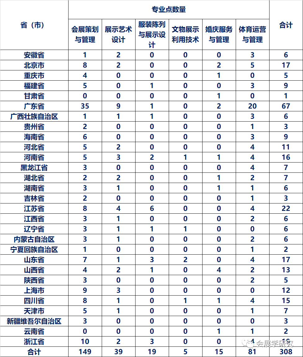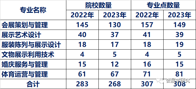 据教育部发布的《教育部关于公布2023年高等职业教育专科专业设置备案和审批结果的通知》,2023年,全国(不含港澳台)共开设了308个专科会展及相关专业点,包括:会展策划与管理(专业代码:540112),展示艺术设计(专业代码550110),服装陈列与展示设计(专业代码:550127),文物展示利用技术(专业代码:550406),婚庆服务管理(专业代码:590304),体育运营与管理(专业代码:570311)。