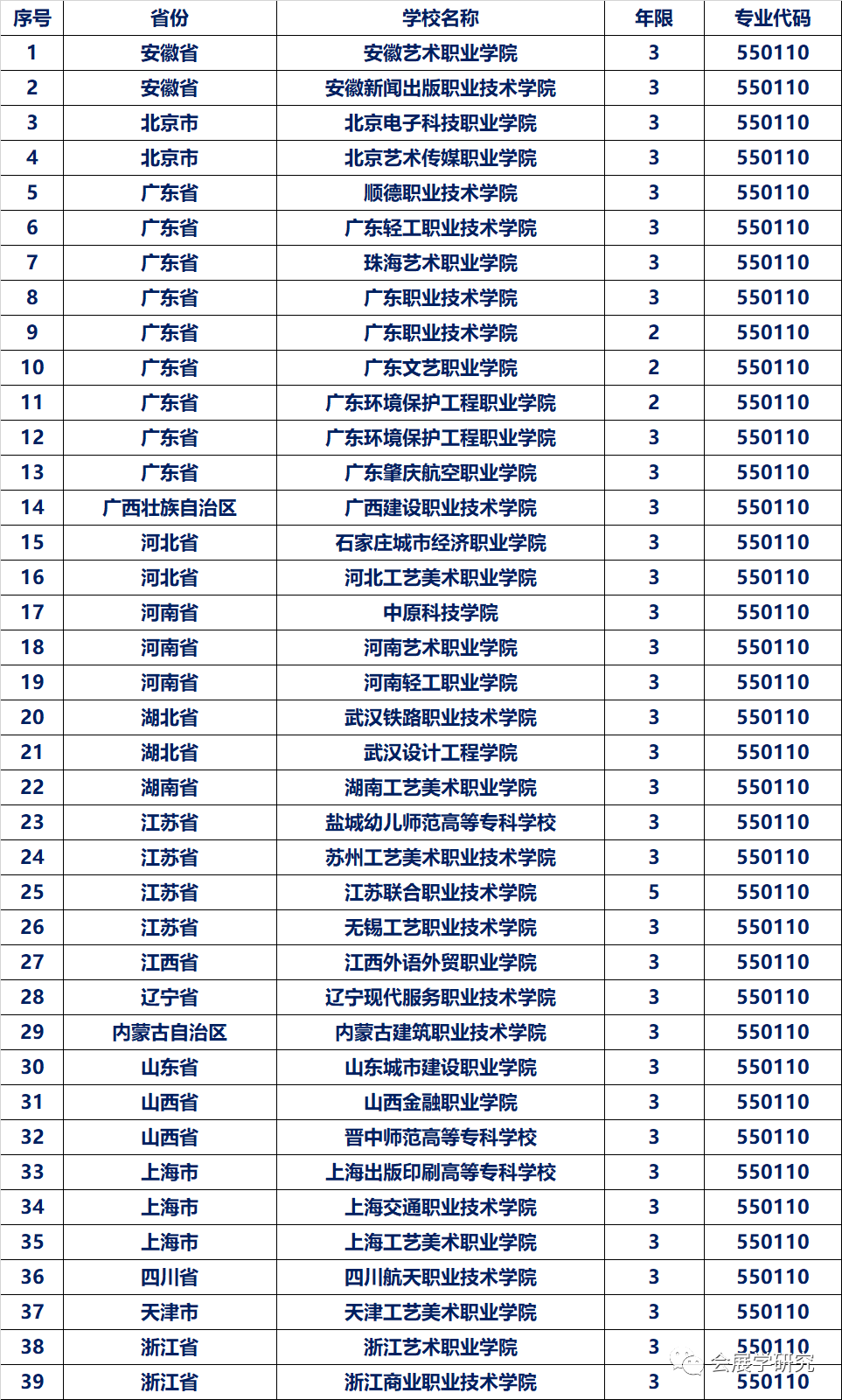 (2)37所院校开设了39个“展示艺术设计”(专业代码550110)专业点。其中,广东职业技术学院、广东环境保护工程职业学院设有两种学制专业点。