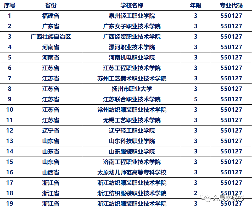 (3)17所院校开设了19个“服装陈列与展示设计”(专业代码:550127)专业点。