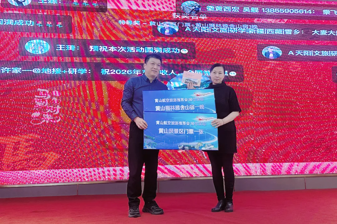 2026年3月17日下午,由黄山市文化和旅游局主办、江西旅游集团航空产业有限公司、安徽飞扬航空运营发展有限公司承办的“黄山航空旅游推介会(哈尔滨站)”在哈尔滨顺利举行。本次活动以“航线搭桥、文旅共融”为主题,旨在抢抓福州航空“哈尔滨=黄山”直飞航线开通的机遇,推动两地文旅资源互通、客源互送、市场共拓。来自福州航空、黄山旅游股份、黄山机场、两地重点旅行社、OTA平台代表等百余位嘉宾齐聚一堂,共话航空旅游融合发展新路径。下午14时,推介会在黄山文旅宣传片的优美画卷中拉开帷幕。黄山市文化和旅游局领导在致辞中表示,黄山与哈尔滨虽南北相隔,但文旅资源互补性强,福州航空直飞航线的开通为两地游客互访提供了极大便利,期待通过此次推介会,进一步推动两地文旅企业深度合作。会上,福州航空代表详细介绍了“哈尔滨=黄山”航线的航班时刻、优惠政策及团队产品,吸引了在场旅游企业的广泛关注。黄山文旅代表则围绕黄山风景区、黟县徽黄旅游集团、古徽州文化旅游区等核心资源,进行了深入推介,并发布了面向东北市场的专项旅游优惠措施,现场反响热烈。为增强互动性,活动设置了多轮抽奖环节,奖品涵盖黄山景区套票、特色伴手礼、福州航空往返机票及飞机模型等,现场气氛高潮迭起,掌声不断。在随后的座谈交流环节,两地文旅企业代表围绕“航空旅游融合发展与两地市场联动”主题展开深入探讨,就产品设计、渠道共建、联合推广等方面达成多项共识。与会代表纷纷表示,将以此次推介会为契机,推动更多实质性合作项目落地。本次推介会的成功举办,不仅全面展示了黄山丰富的文旅资源和精品线路,也为两地文旅企业搭建了高效对接的平台,进一步提升了黄山在东北地区的旅游品牌影响力。未来,随着“哈尔滨=黄山”直飞航线的稳定运营,两地文旅合作将迎来更加广阔的发展前景。