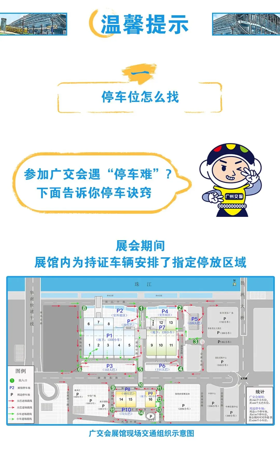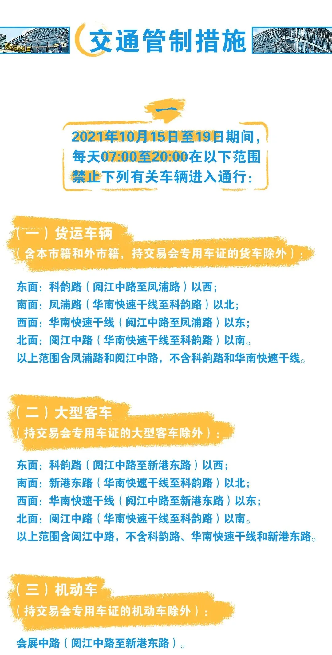 采样时间:10月11日-18日10:00-21:00。1.广交会展馆1号门(广交会展馆1号门公交会展中心码头站旁)2.广交会展馆2号门(广交会展馆2号门公交会展中心北站旁)5.广交会展馆C区(广交会展馆C区16号馆北面人行道)采样时间:10月15日-19日8:30-15:005.中大凯丰酒店(海珠区滨江东路588号中山大学北门)8.广州华海大酒店(海军华海大厦)(海珠区江南大道中232号A座)采样时间:10月11日14:00-22:00,10月12日-18日18:00-22:00(一)(二)采样点,参展参会人员在穗康小程序“广交会专区”预约后,可持本届广交会有效证件前往检测;(三)采样点,参展参会人员无需预约,持本届广交会有效证件即可检测。❖广交会期间,八号线将采用广交会专用时刻表,即工作日期间,预计高峰期上线 39 列车,较日常增加 4 列;周六、日期间高峰上线 37 列车,较日常增加 10 列。❖广州地铁将进一步严格落实进站防疫排查,做到三个100%,即100%测温、100%亮码通行、100%佩戴口罩。❖地铁进站乘客均需按照“人过门、物过机”要求实施安检。❖广交会举办期间,将按规定不实施“开四停四”管理措施。❖警方建议前往参展的朋友,尽量选择公共交通工具,避开早晚高峰时段,服从现场民警和工作人员指挥。❖这些路段将实施交通管制。