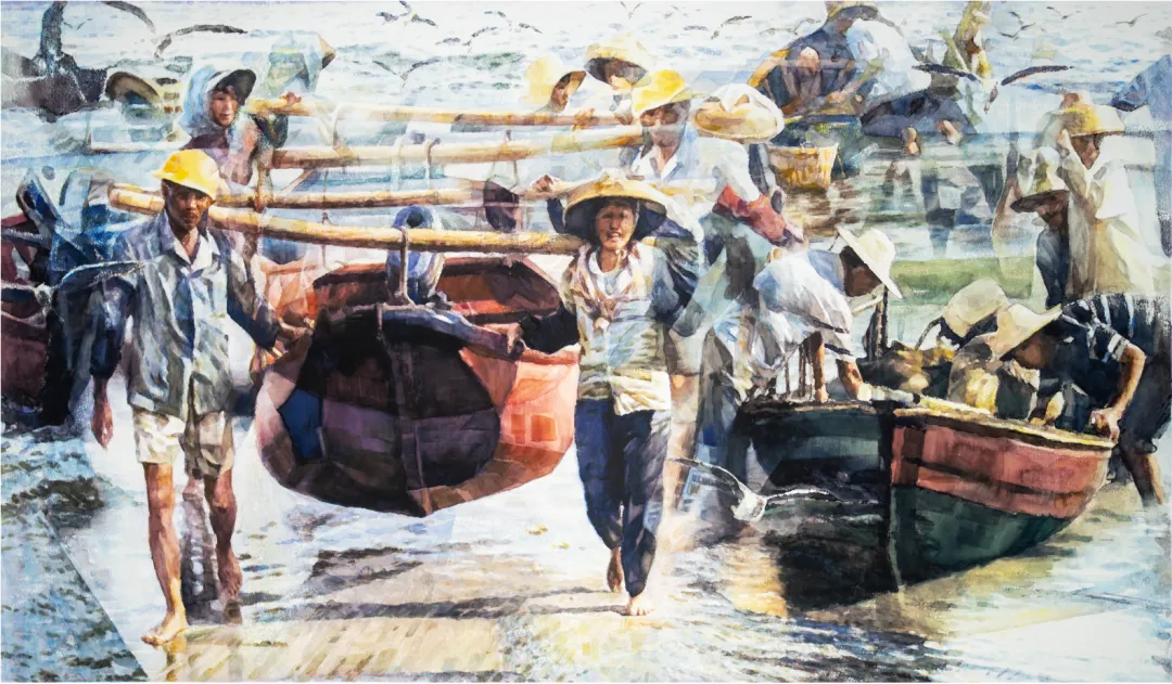 《渔港晨曦》 李醒韬 72cm ×125cm 水彩画 2000年