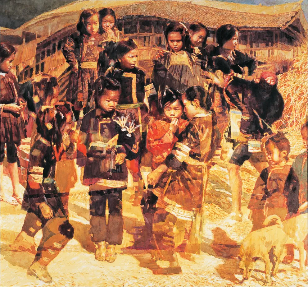 《踢毽子》 李醒韬 133cm × 140cm 水彩画 2001年