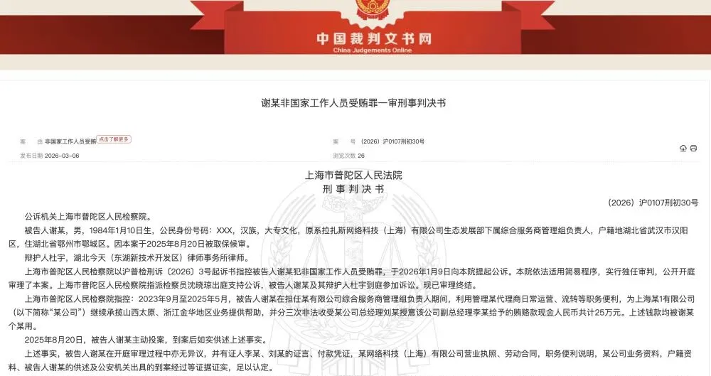中国裁判文书网显示,拉扎斯网络公司(饿了么运营主体)一名员工受贿25万元,主动投案判缓刑1年。