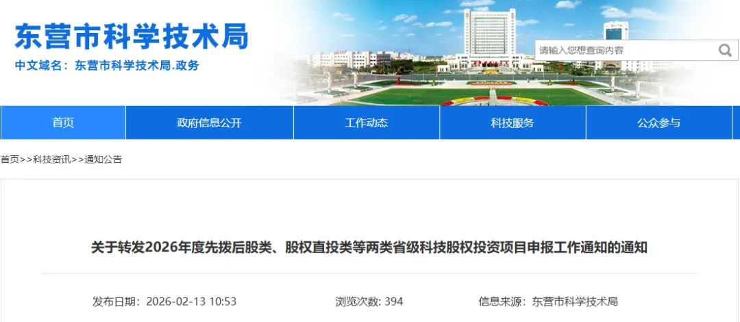 现将省科技厅《关于组织开展2026年度科技股权投资项目(先拨后股类)申报工作的通知》(http://kjt.shandong.gov.cn/art/2026/2/12/art_13360_10323699.html)、《关于组织开展2026年度科技股权投资项目(股权直投类)申报工作的通知》(http://kjt.shandong.gov.cn/art/2026/2/12/art_13360_10323700.html)转发给你们,请按照通知要求,组织有意向申报上述两类省级科技股权投资项目的企业,通过山东省科技云平台进行申报。