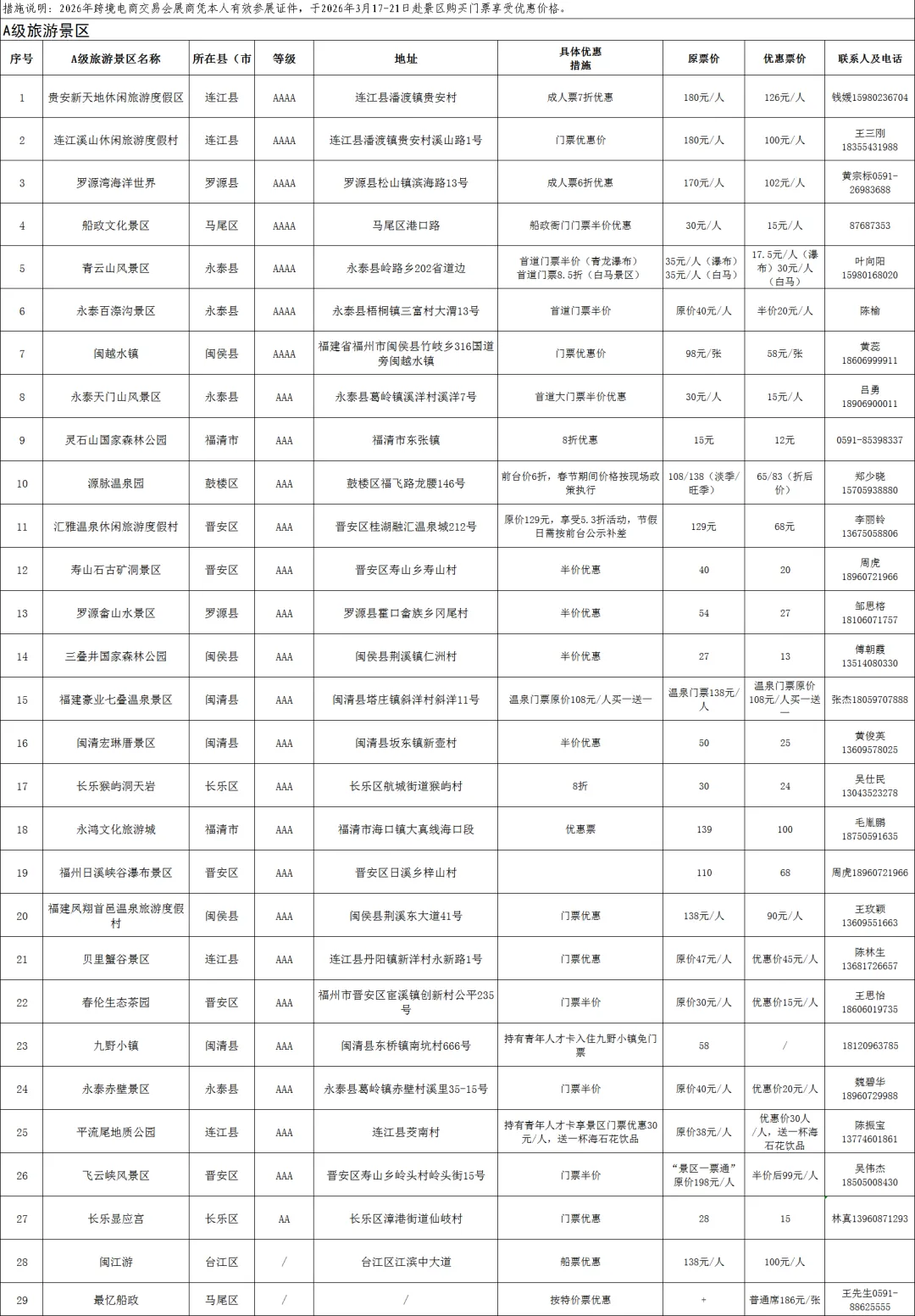 整合全市15个精选A级景区、4条精品旅游线路,及船政文化景区、寿山石古矿洞、闽越水镇、闽江游船等29个核心文旅景区(项目),推出展会专属文旅优惠。