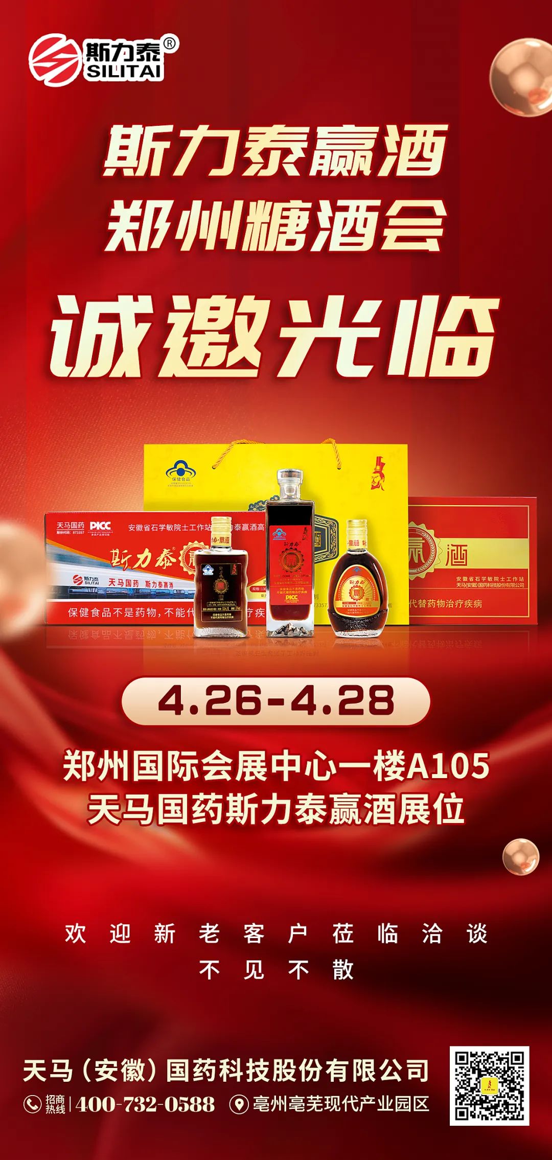斯力泰集团展厅位于郑州国际会展中心一楼A105,高端大气、色彩鲜明的布展带来强烈的视觉冲击,每个细节都洋溢着斯力泰集团的品牌调性。参展的产品包括“斯力泰赢酒”、“华佗固元酒”、“力悦达虫草蜂王酒”等众多产品,展厅里人潮涌动,高品质的服务和销售团队使人赞不绝口、流连忘返!