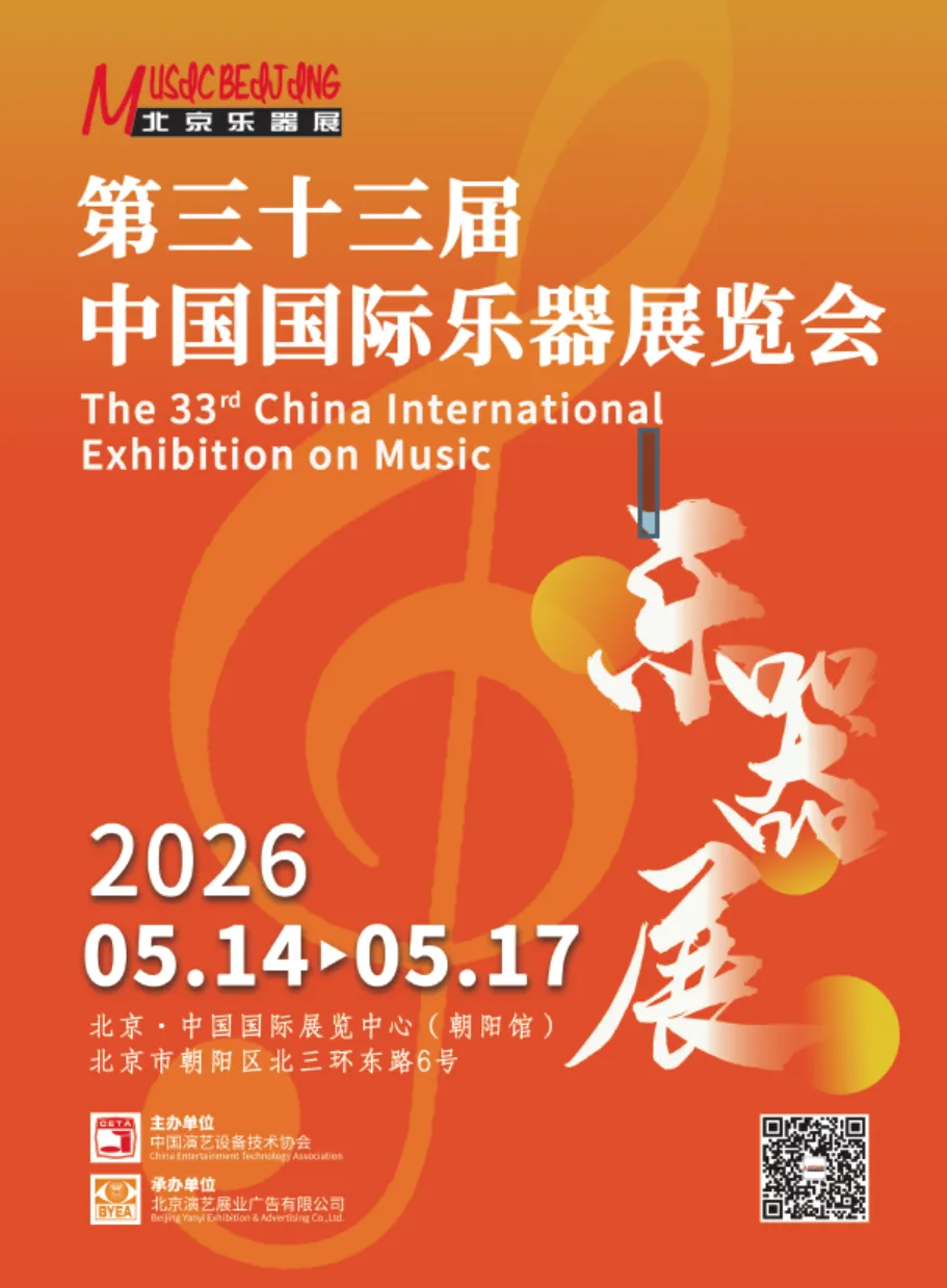 2026第三十三届中国国际乐器展览会(北京国际乐器展)将于2026年5月14-17日在北京老国展继续举行,2026依然主打电声馆,所有原有老客户展位优先、服务优先,同时热烈欢迎新客户,相约北京,共同振兴。